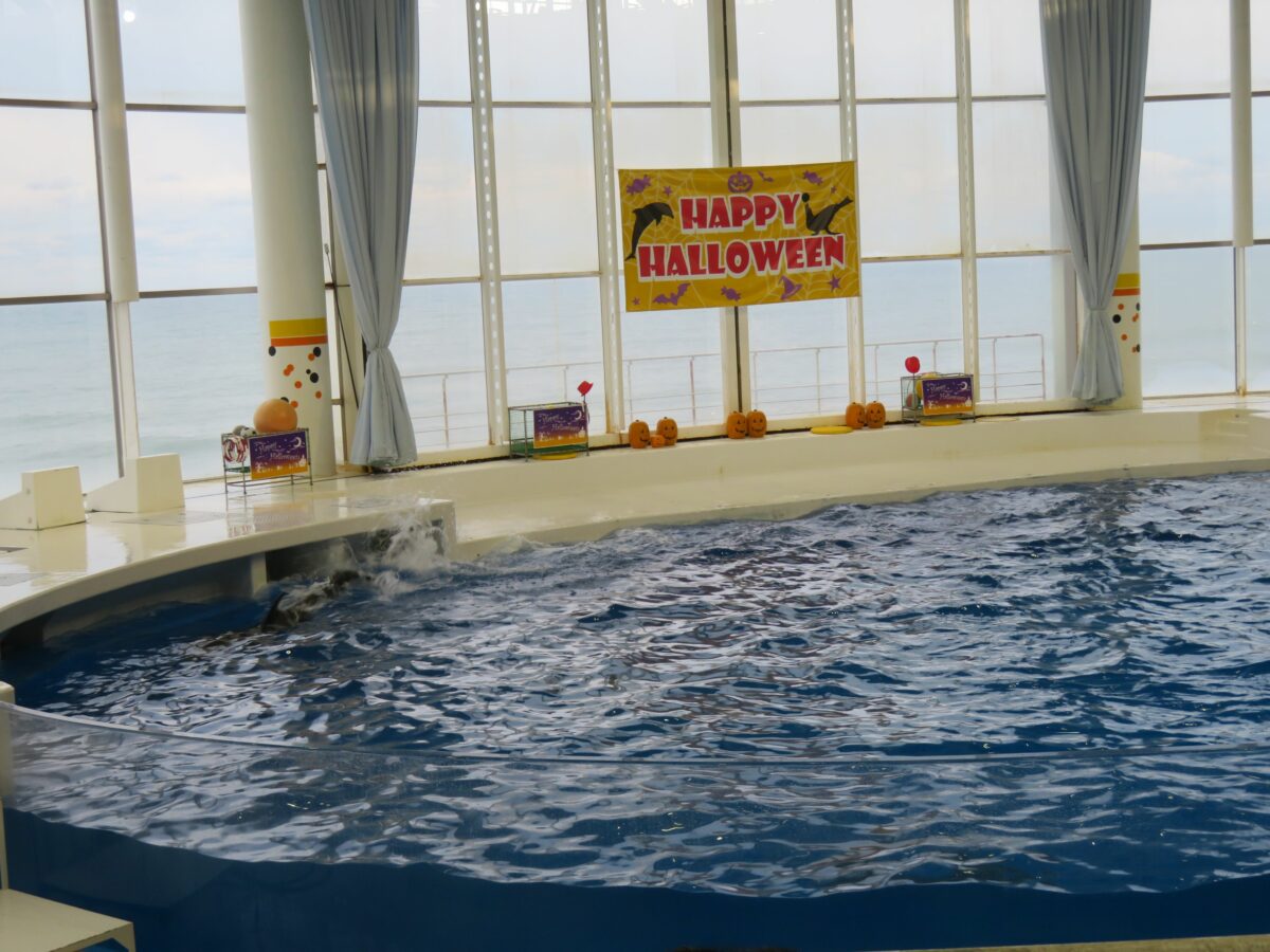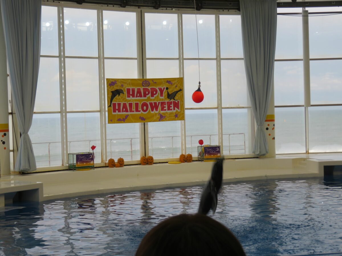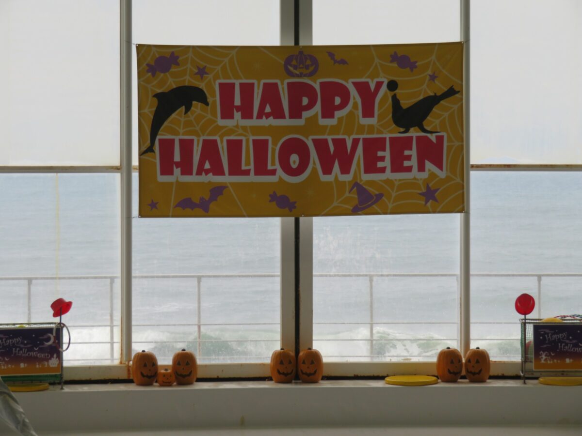 1日5回、ショーが行われるオーシャンライブの会場も、ハロウィンの装飾が施されています。ステージに並ぶ「ジャック・オー・ランタン」には窓越しに、鹿島灘の波が押し寄せてきます。太平洋の波がハロウィンの装飾に力強い演出をしているようです。