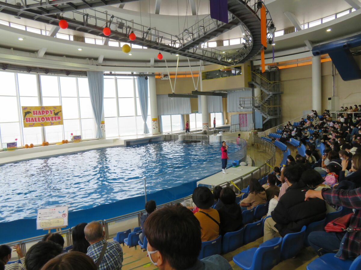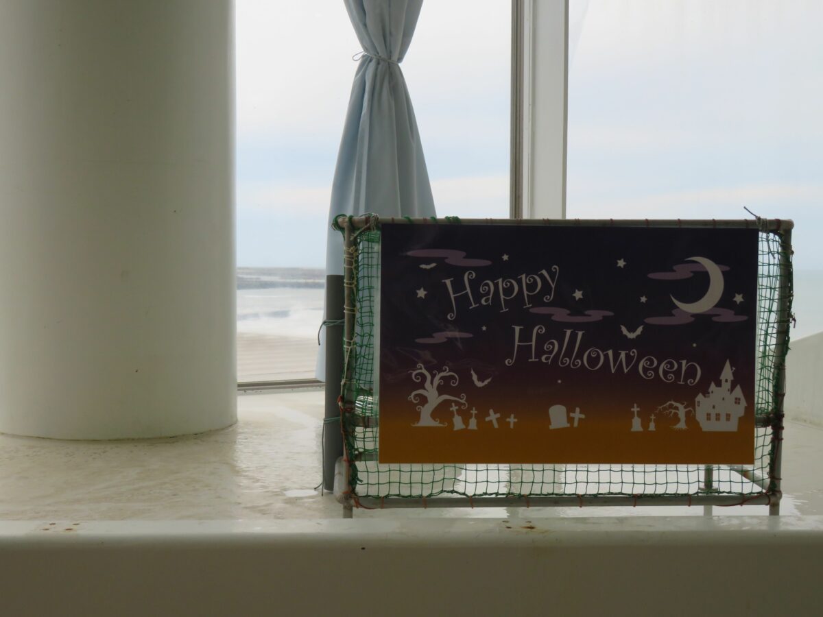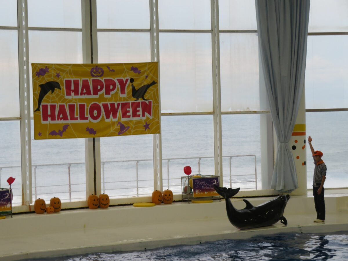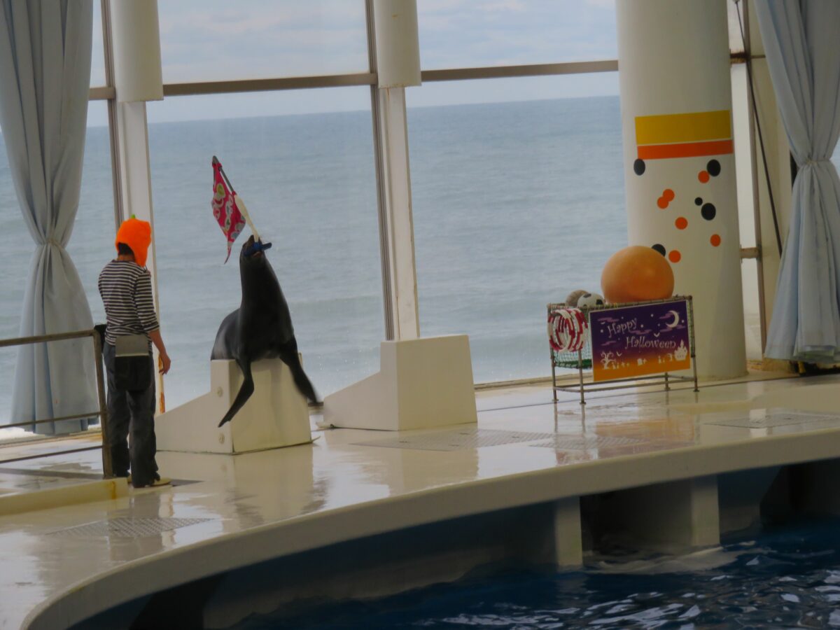 1日5回、ショーが行われるオーシャンライブの会場も、ハロウィンの装飾が施されています。ステージに並ぶ「ジャック・オー・ランタン」には窓越しに、鹿島灘の波が押し寄せてきます。太平洋の波がハロウィンの装飾に力強い演出をしているようです。