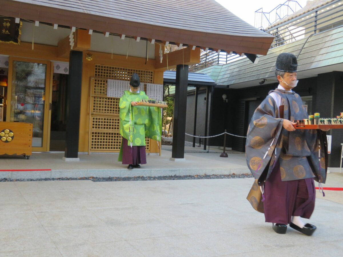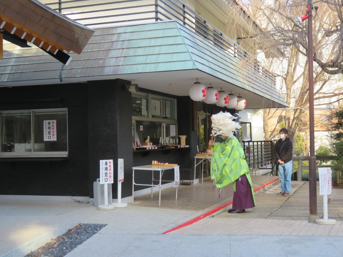 15:00になると授与所の前に神主が姿を現します。返納された木彫りの鷽の前で大麻を振るい、お祓いの神事が始まるのです。