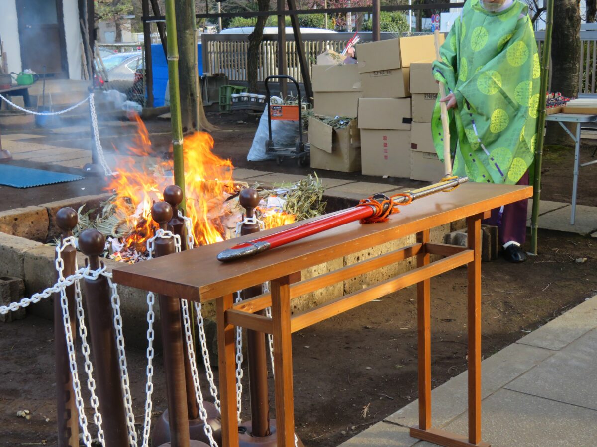 木彫りの鷽が炎の中で焚き上げられている間には、何度も神主によるお祓いが行われます。お祓いの道具として、日本刀が使われる場面もあります。