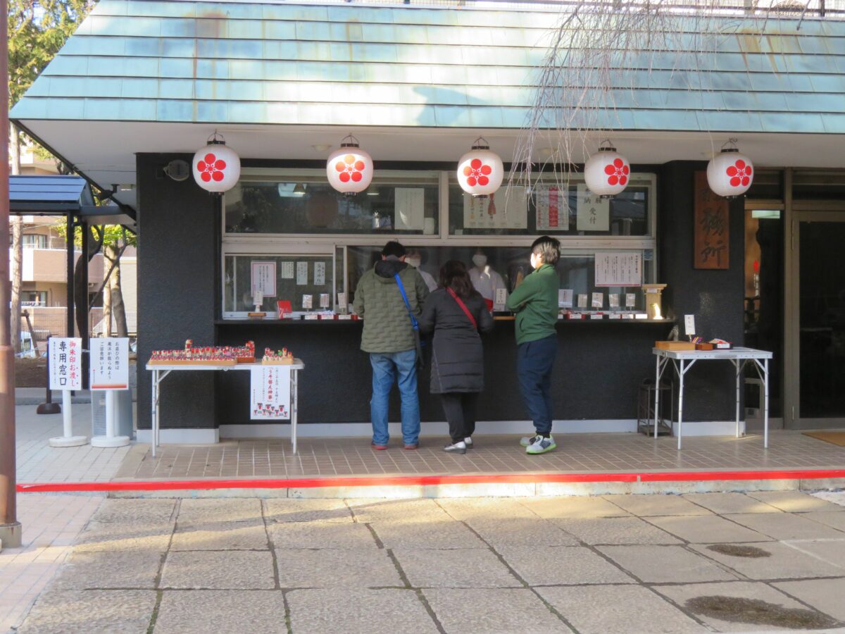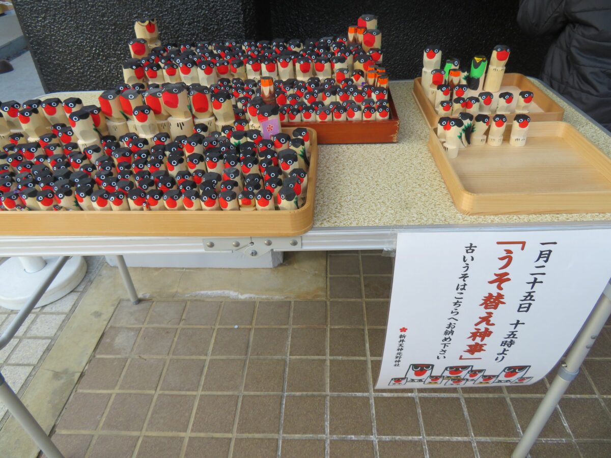 新井天神北野神社では本殿の東の授与所で、木彫りの鷽を交換することができます。授与所前に設置されたデスクの上の盆に前年の木彫りの鷽を納め、新年のものを授与して頂くのです。「うそ替え神事」は15:00から行われるので、それまでに前年の木彫りの鷽を返納しなければなりません。
