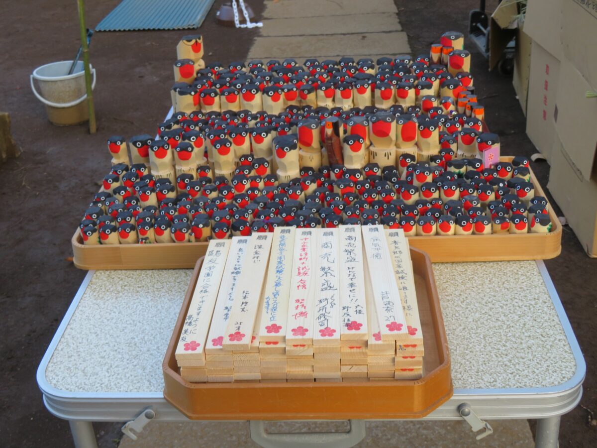授与所の前に準備された前年の木彫りの鷽を納める盆