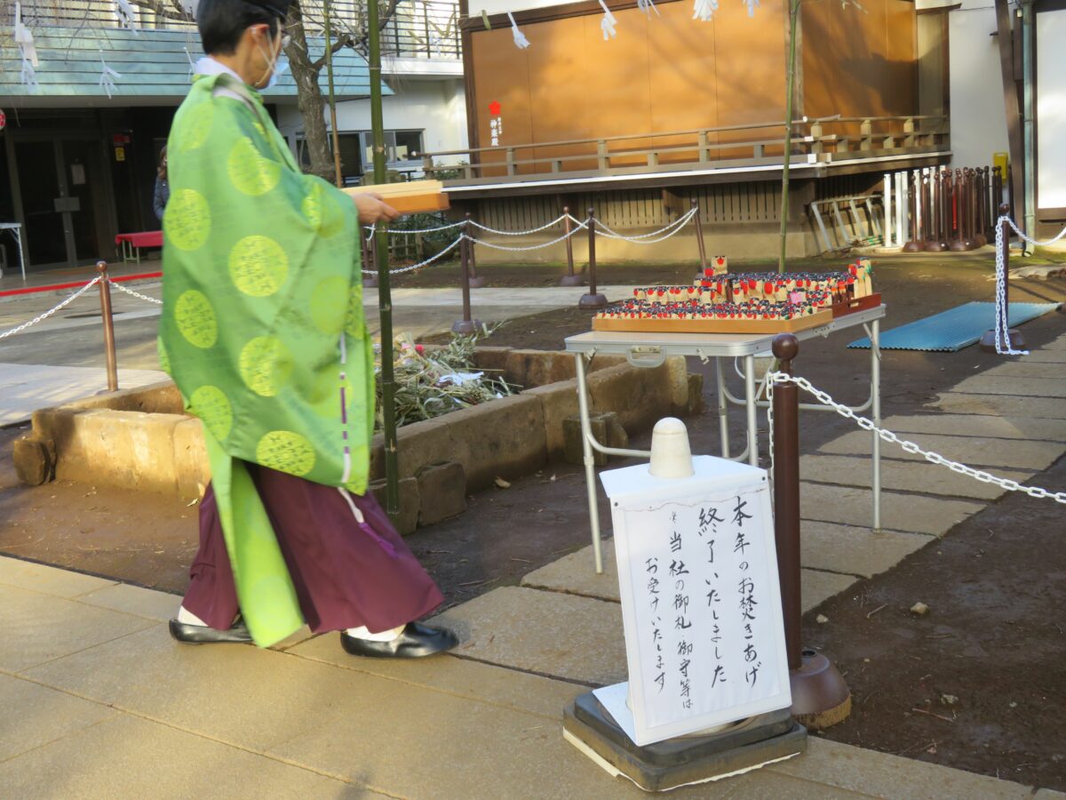 本殿神棚から焚き上げ場に移される木彫りの鷽
