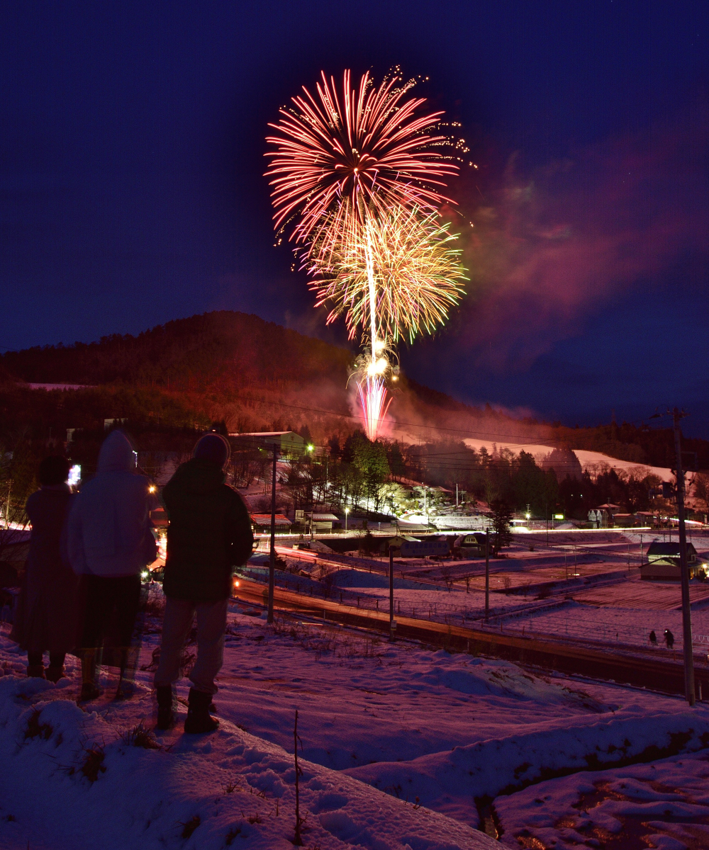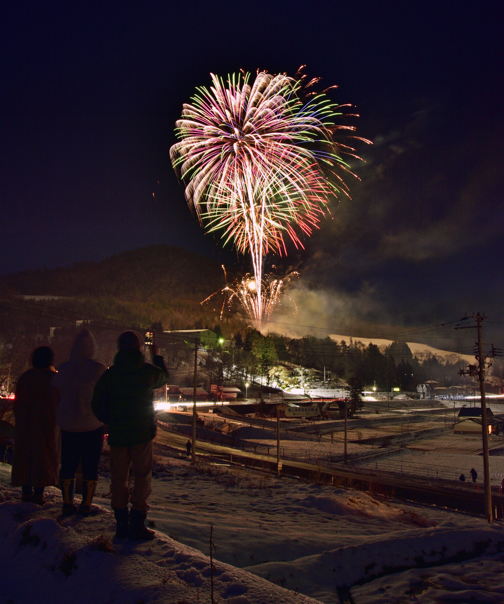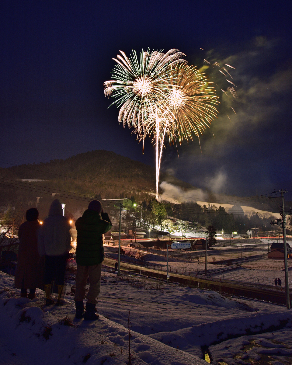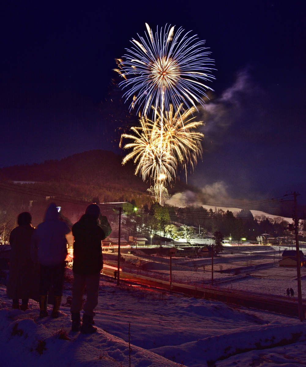 前日からの大雪により、棚田が一面雪化粧したお陰で、花火の色が映えて美しいです。