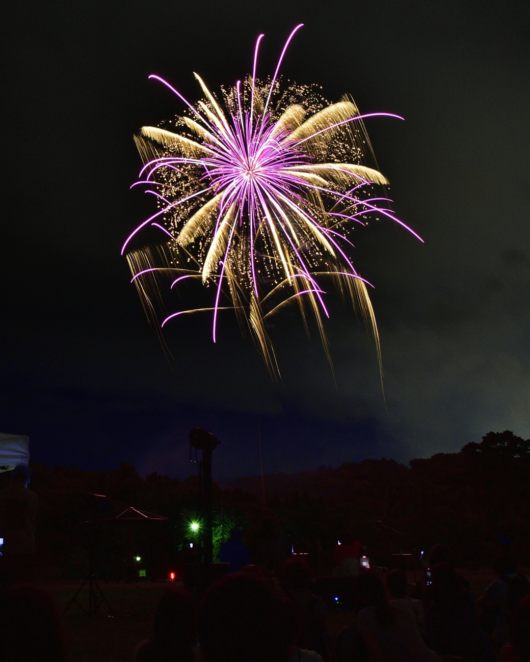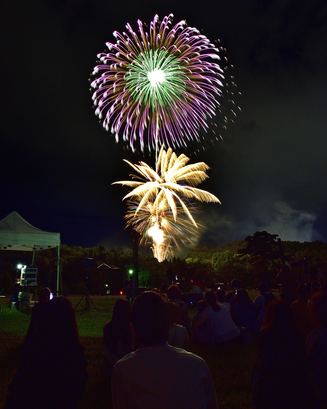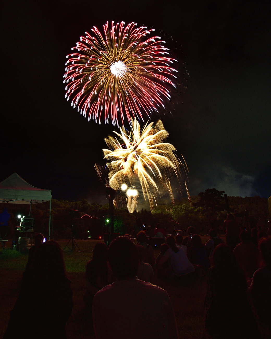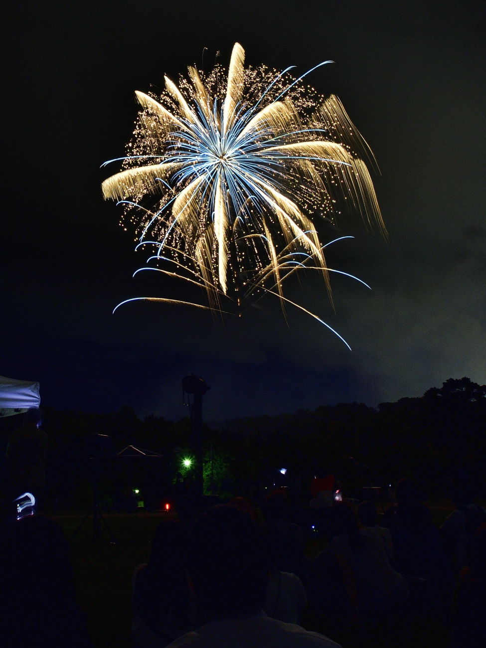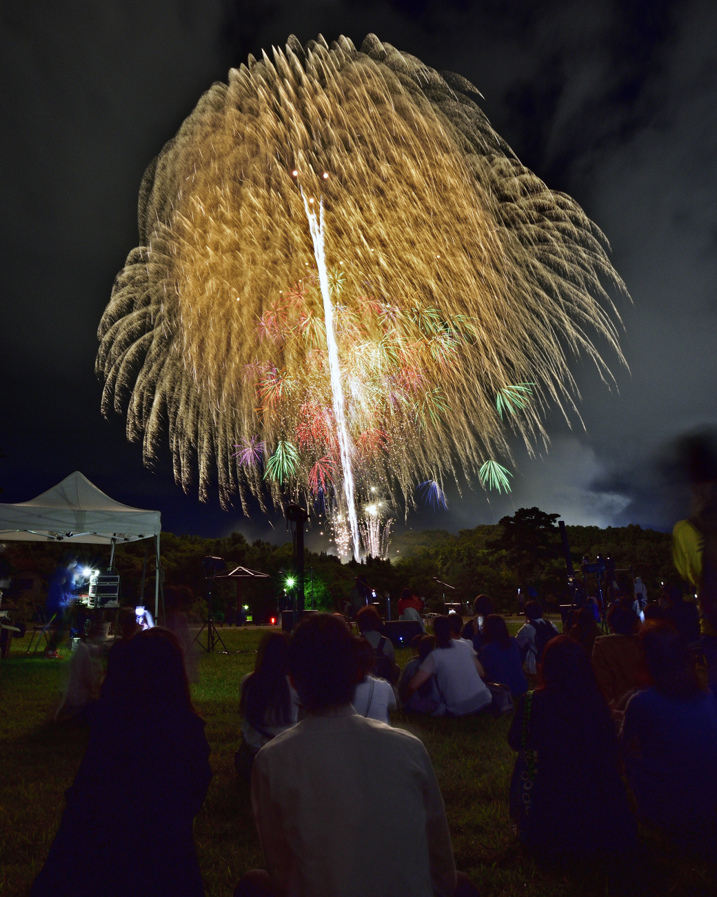 “金冠“(”きんかむろ”。フィナーレでたくさん打つ、金色で降り注ぐ花火)