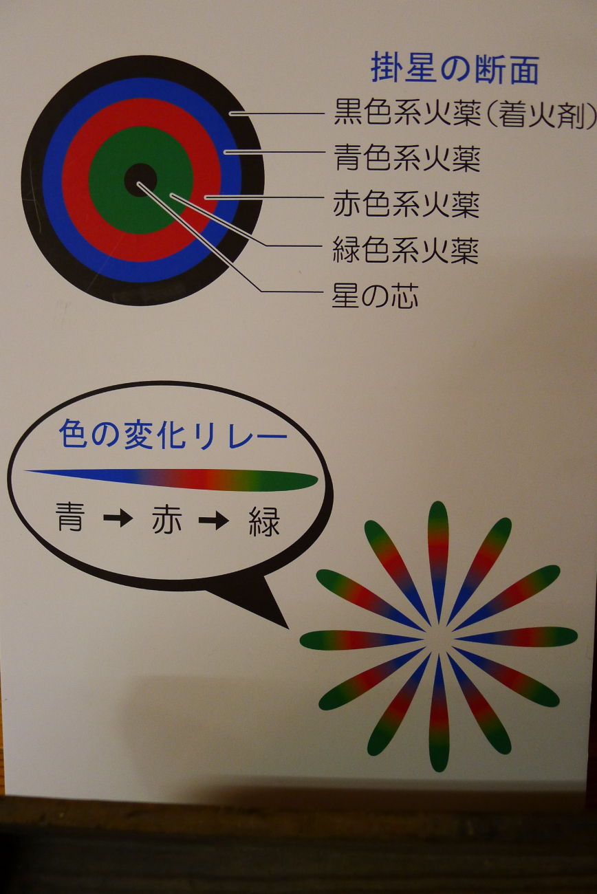 通常、花火の色を出す火薬玉(星と呼ぶ)は、1色の火薬を、攪拌しながら玉にしていきますが、