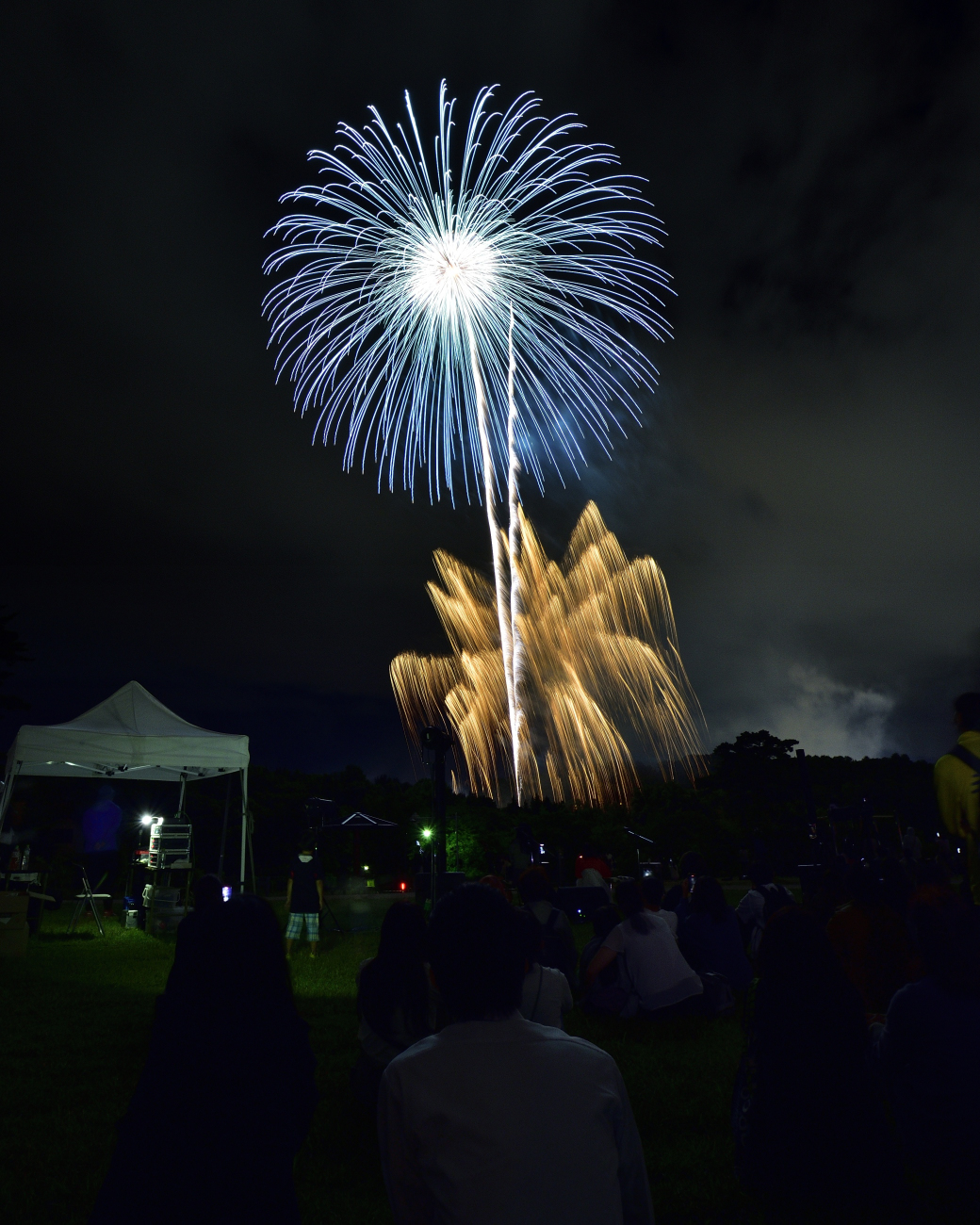 “八重芯”(全体で3層になる花火)の大玉が上空を、金色のヤシ(ヤシの木のような太い筋の花火)