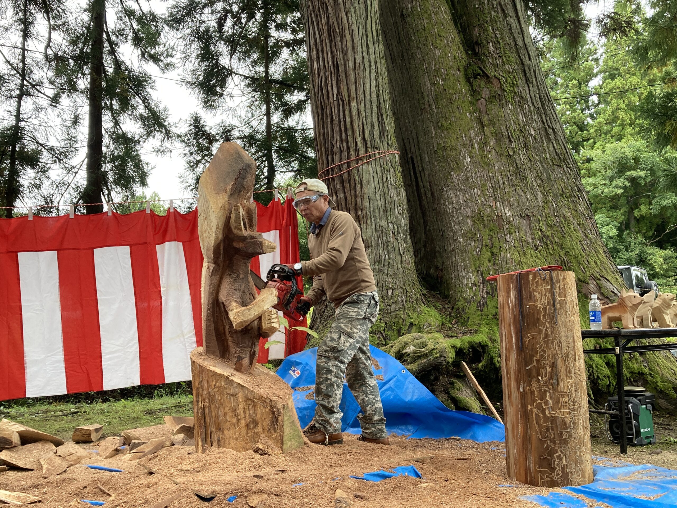 さまざまな催しの合間に鳴り響いていたチェーンソーの音は、高柳町出身の石塚廣男さんによる木彫りのパフォーマンスです。一本の大きなスギの丸太が削られていき徐々に形になっていくと、最後には狐が姿を表しました。
