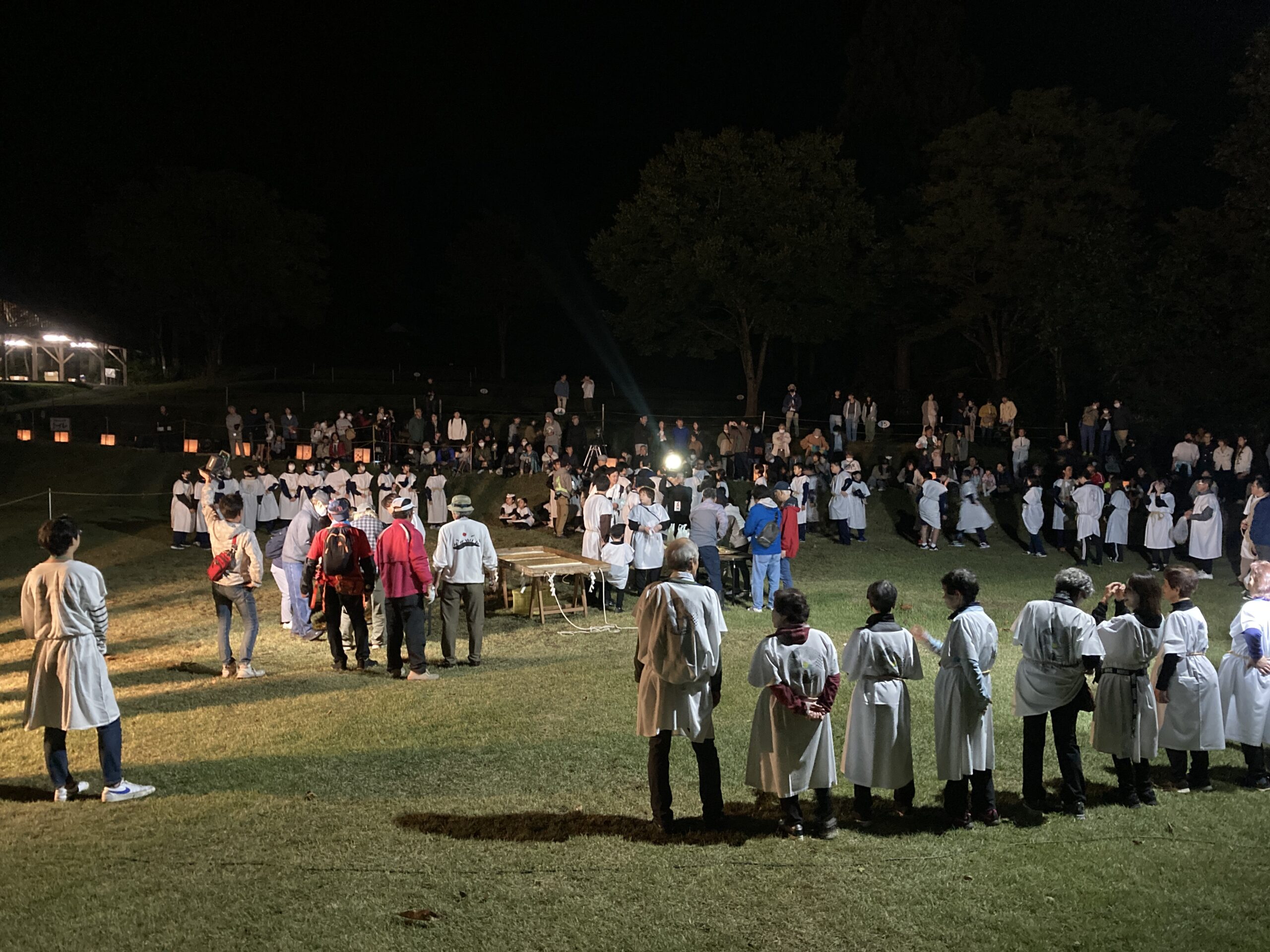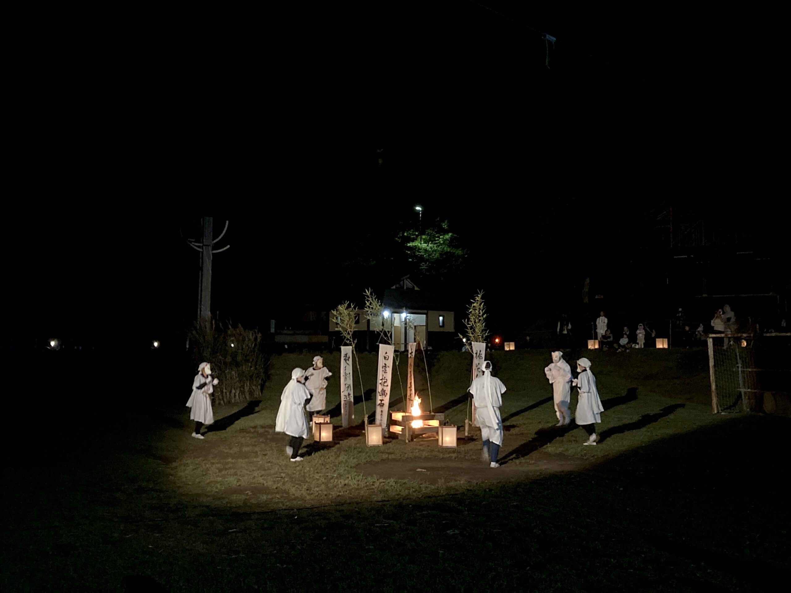焚き火の周りで狐に扮した白装束の人々が踊ります。