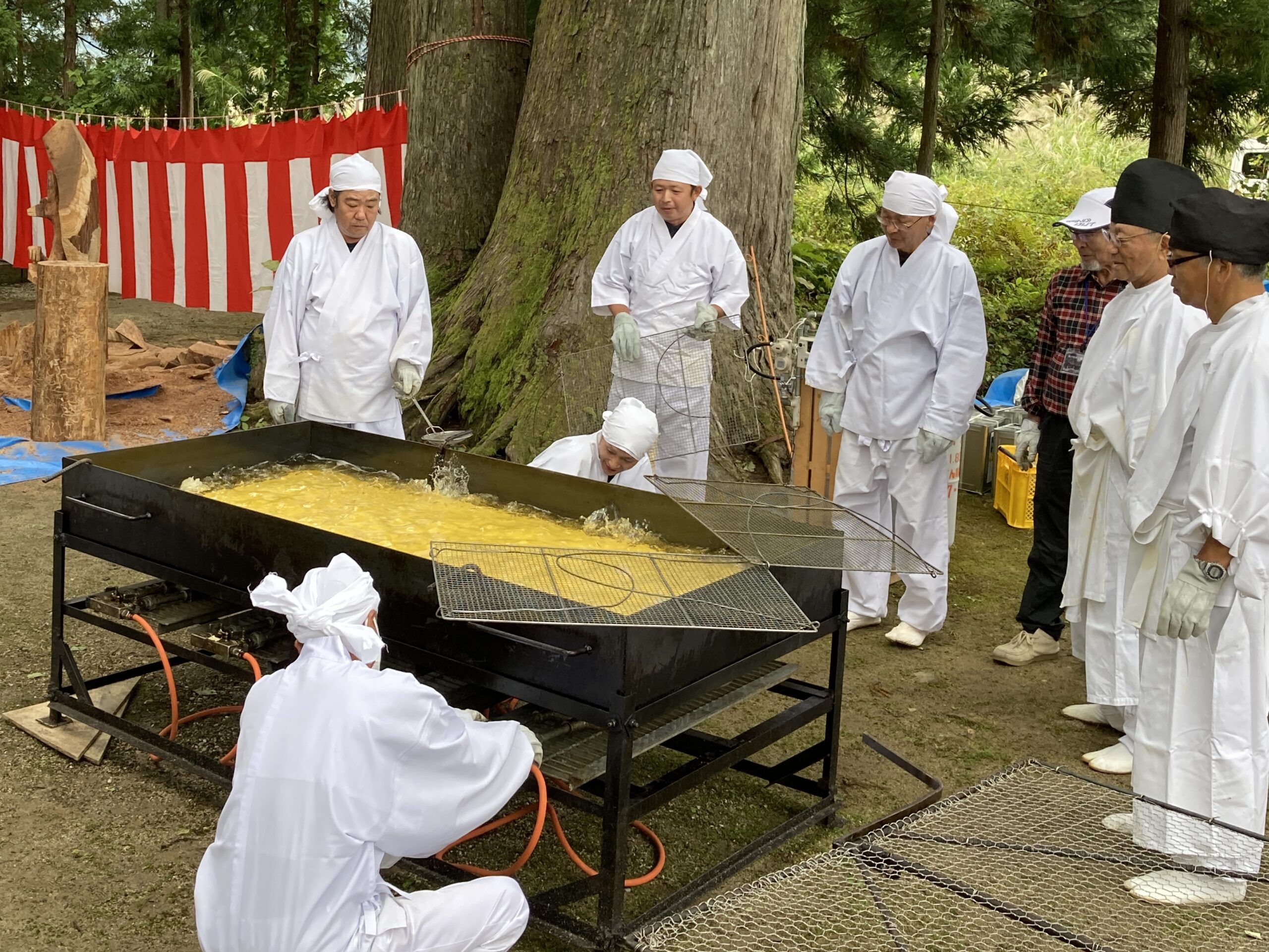 白装束を着た方々がゆっくりと慎重に生地を運んでいき、生地を鍋に沈めていくと、油がボコボコと波打ち、とても迫力があります。