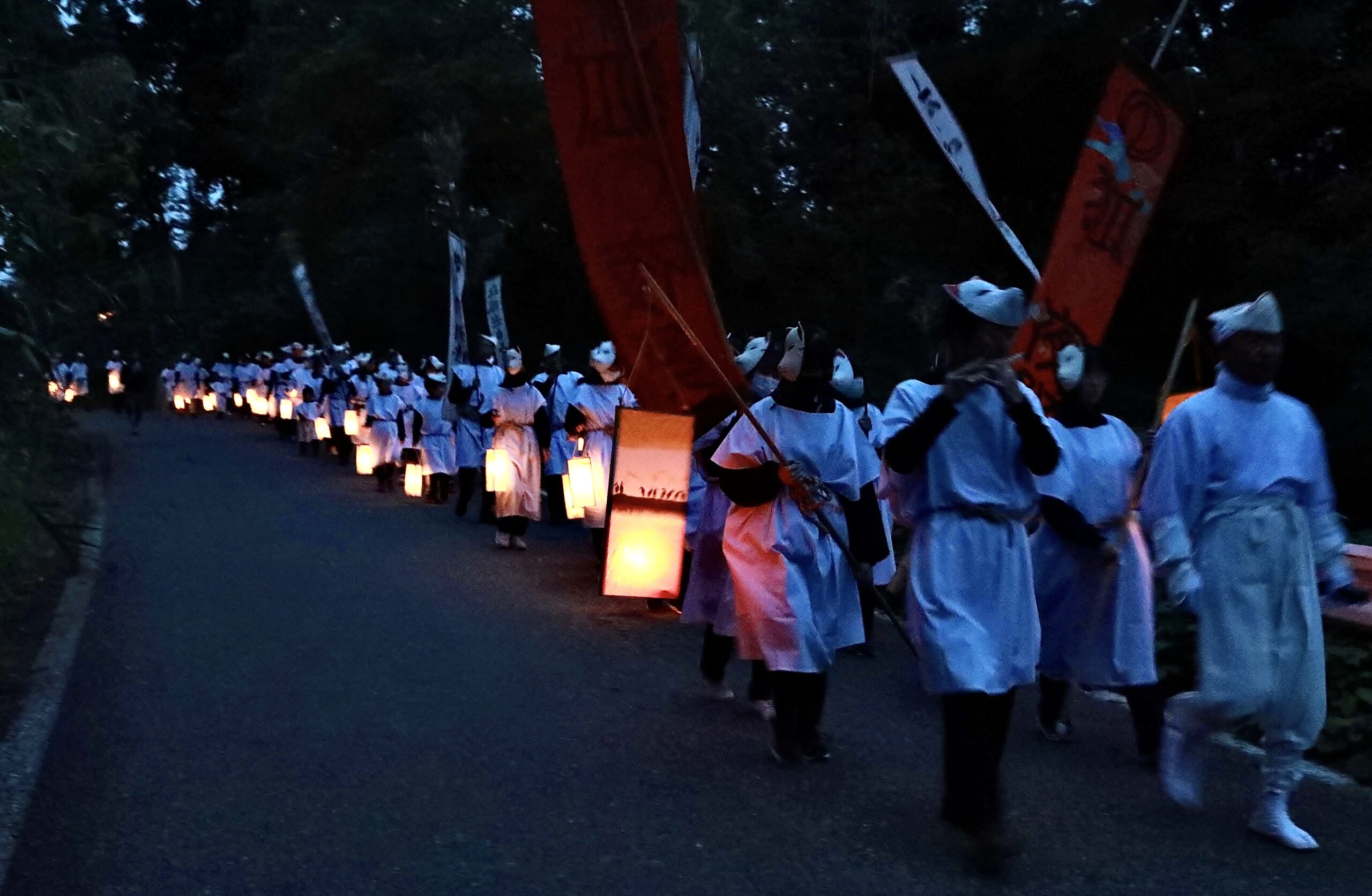栃ヶ原会場からこども自然王国まで約4㎞1時間の道のりを、提灯を持った狐の行列が進みます。