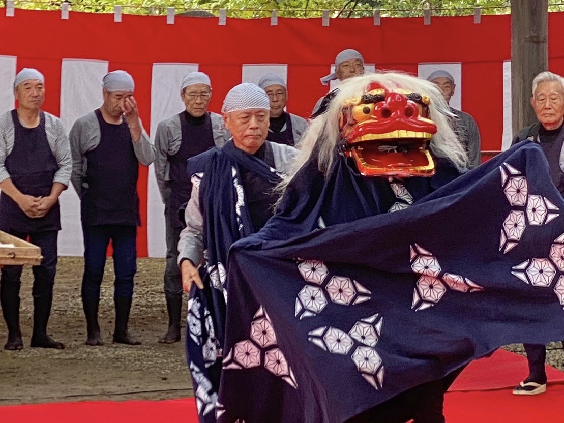 「黒姫神社保存会」の皆さま。獅子が舞いお祭りを祝福します。
