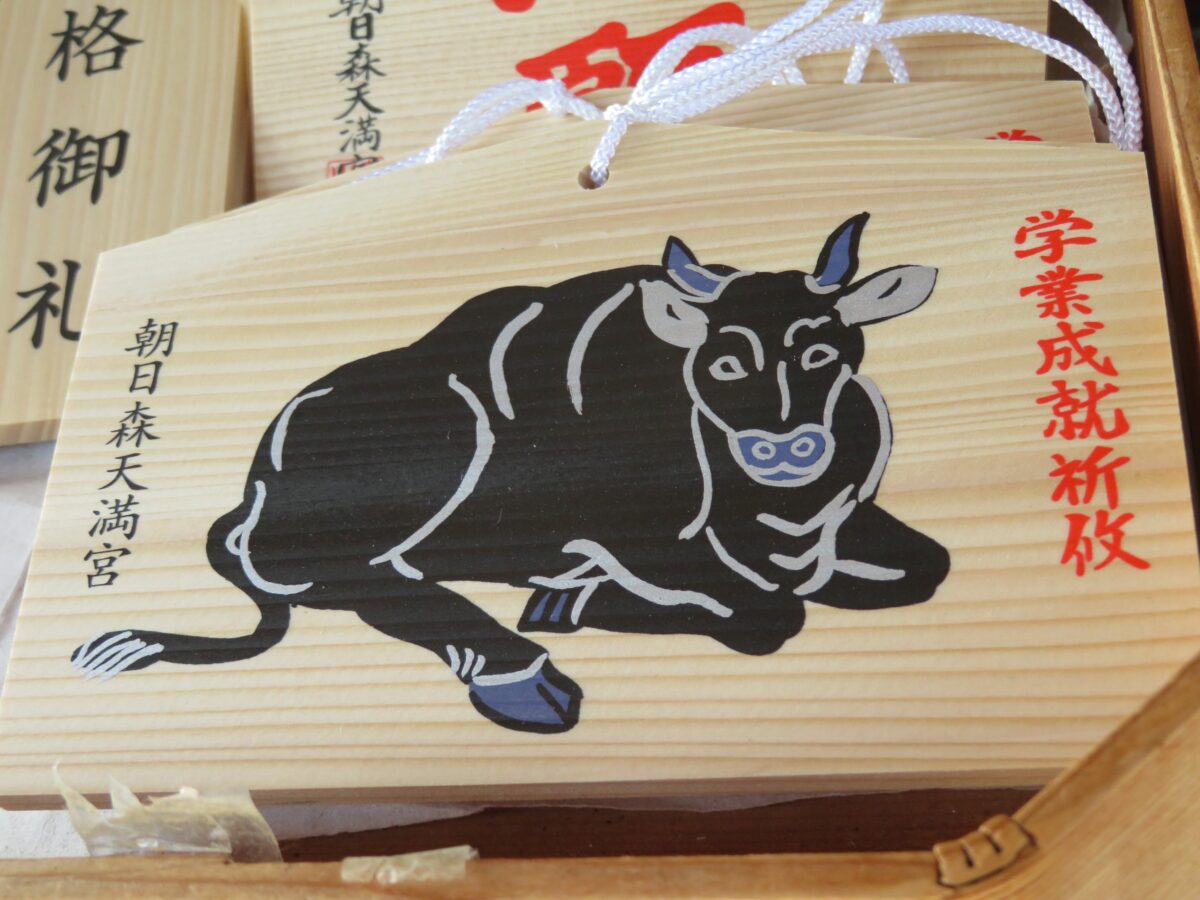 授与品の中には、拝殿の正面に安置される「天神様のなで牛」をあしらったお守りや絵馬も準備されています。天神信仰では牛が神の使いとされているのです。