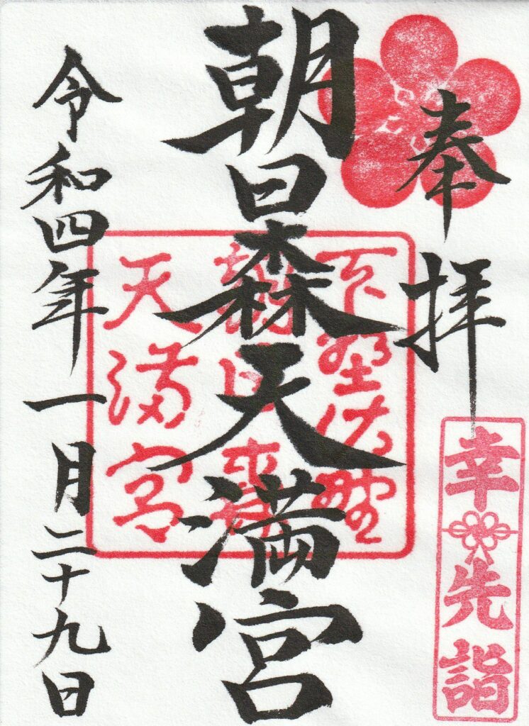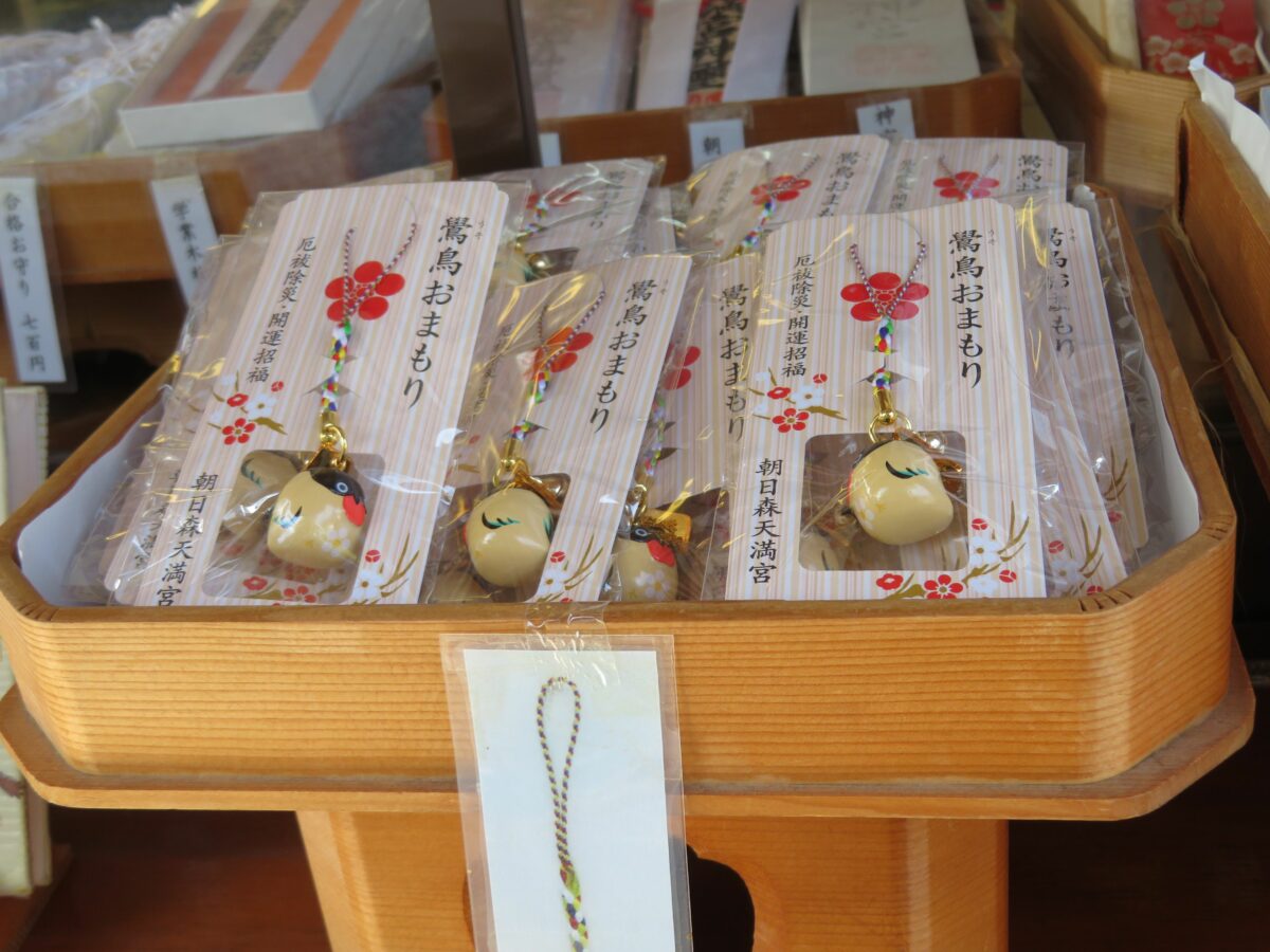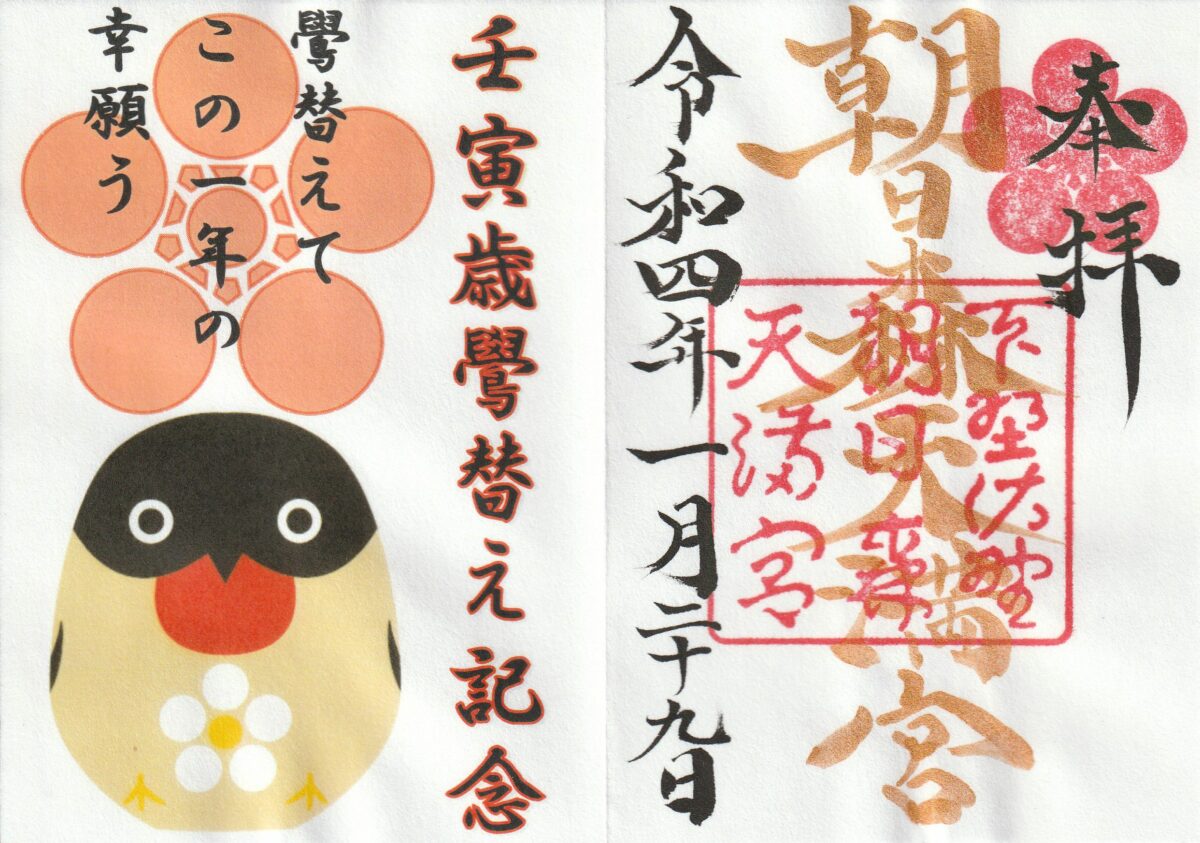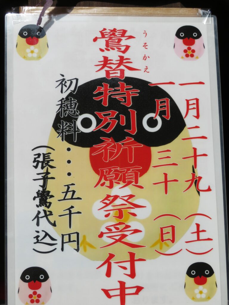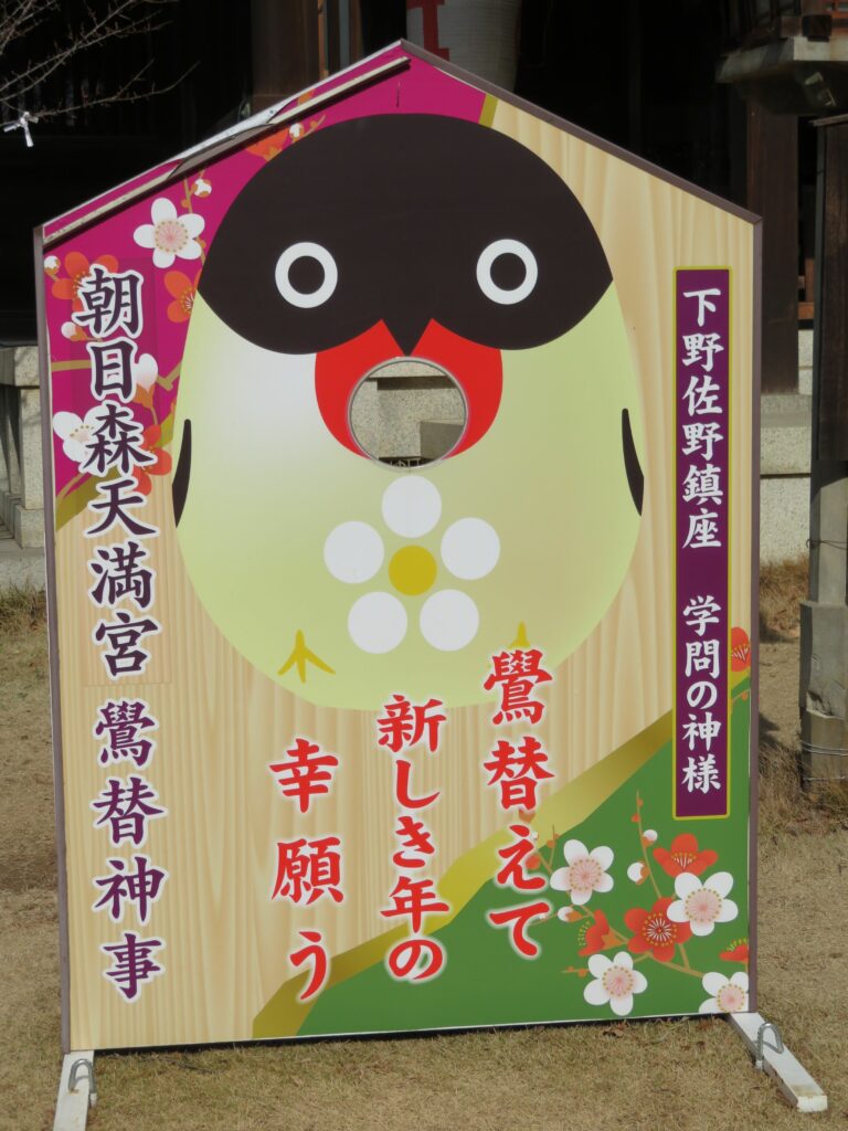 栃木県佐野市の朝日森天満宮では菅原道真をご祭神として祀り、例年1月下旬には「鷽替神事特別祈願祭」が開催されています。拝殿の前には鷽鳥の描かれたフォトパネルが設置されるばかりでなく、期間限定の御朱印やお守りが頒布されます。