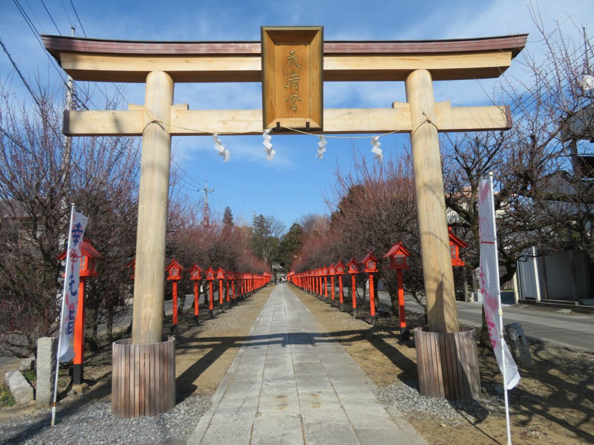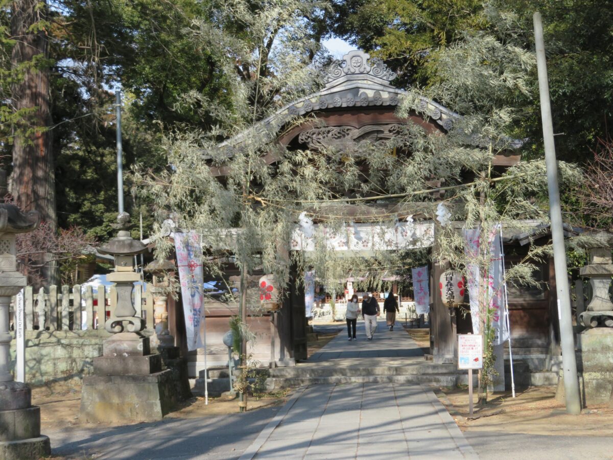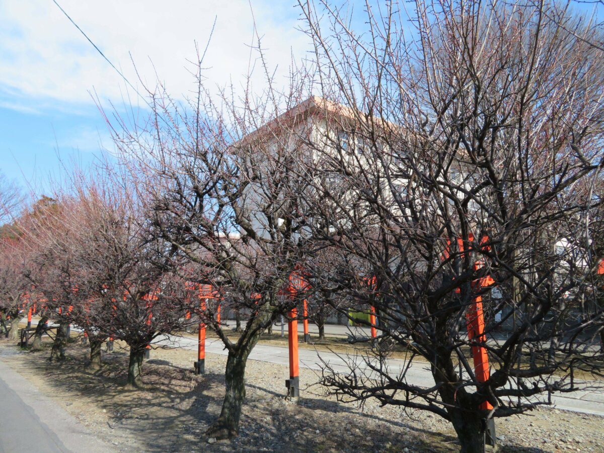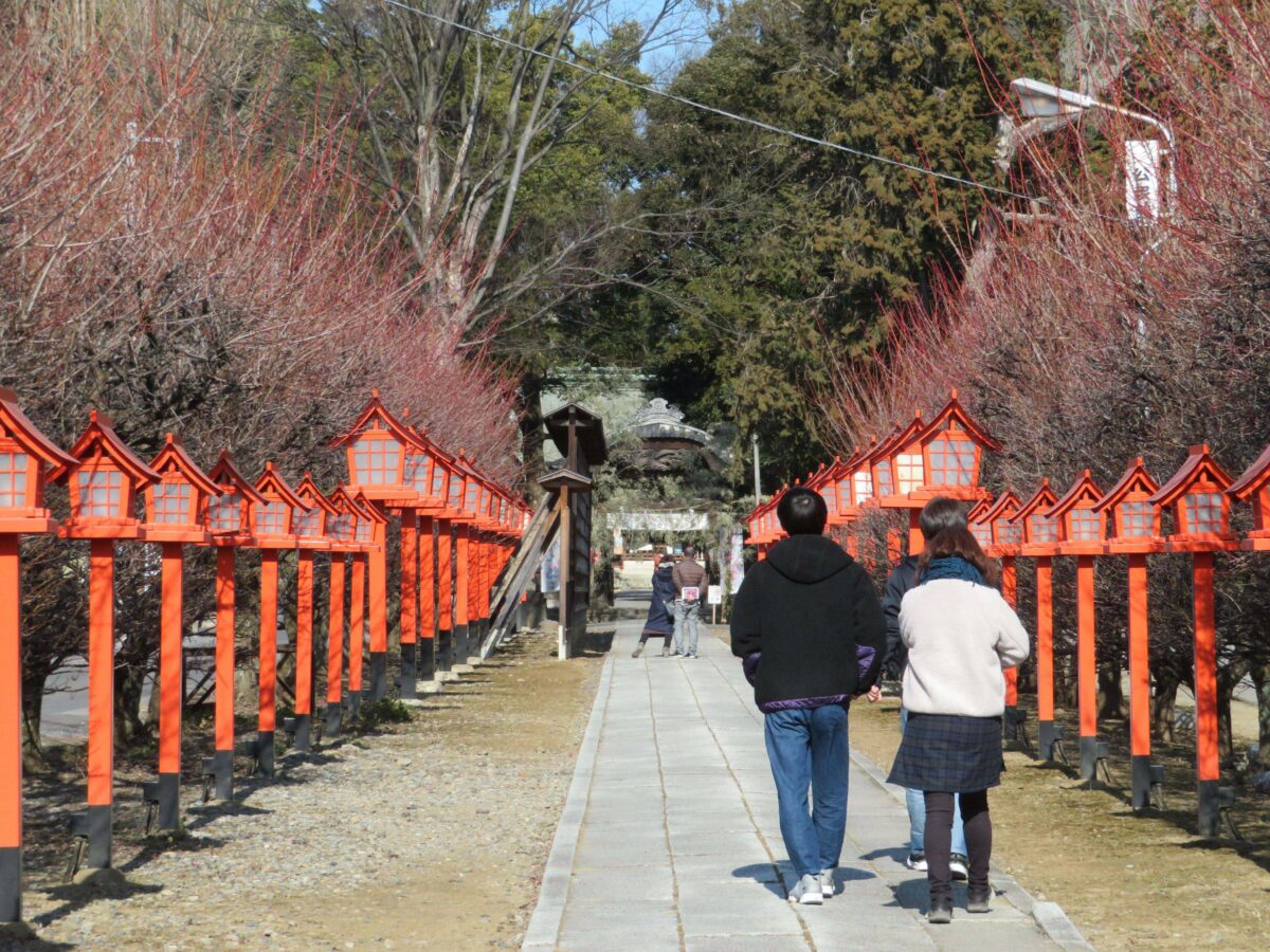 神社の境内の正面玄関には堂々とした神門が建立され、二の鳥居から一直線の参道を歩いてきた参拝者を出迎えます。参道の左右には朱色の灯篭に沿って梅が植樹され、初春には季節の彩りで参拝者の目を楽しませてくれることでしょう。