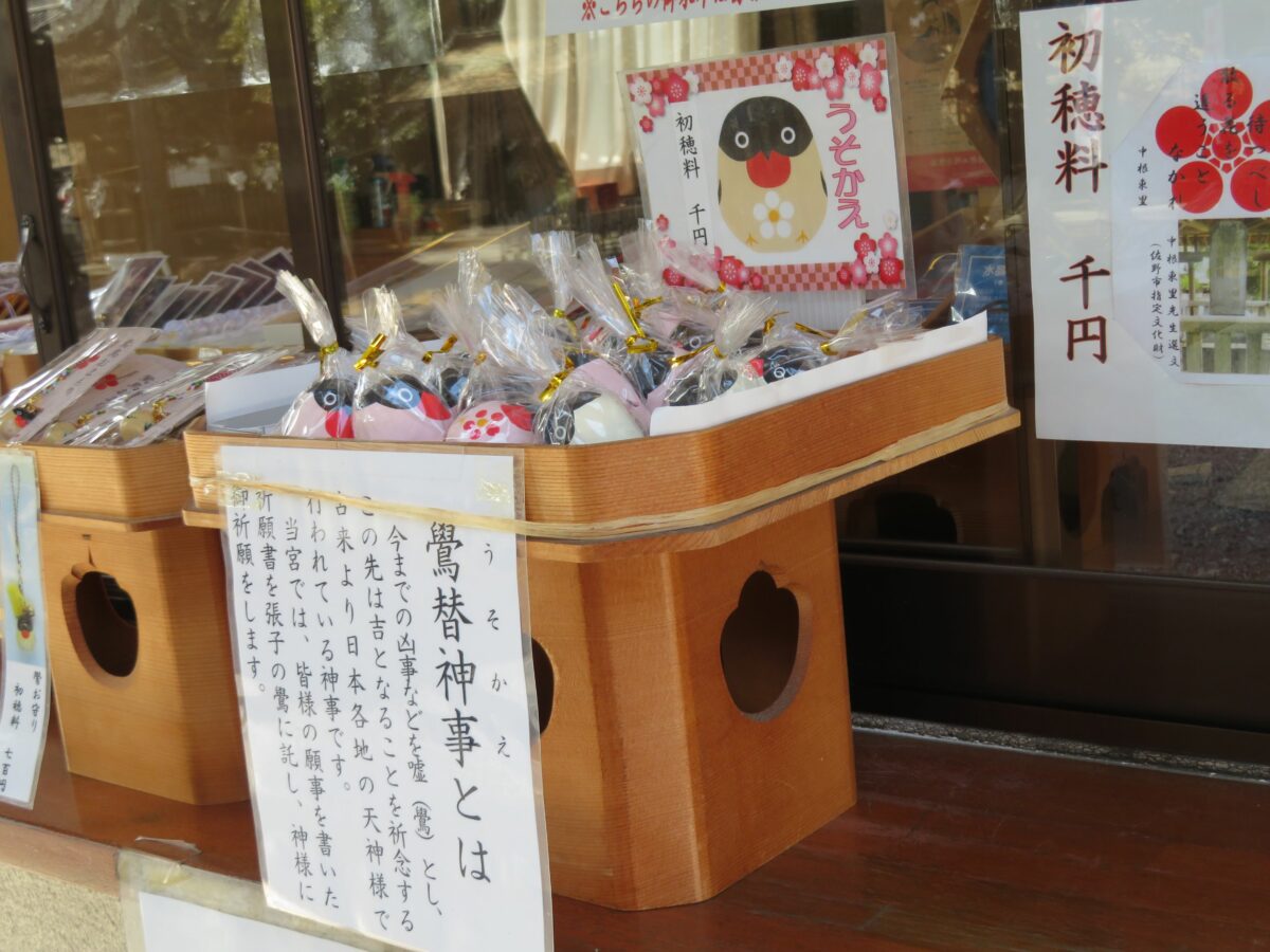 拝殿の西の社務所では、鷽替の御朱印や鷽鳥おまもりが頒布されています。