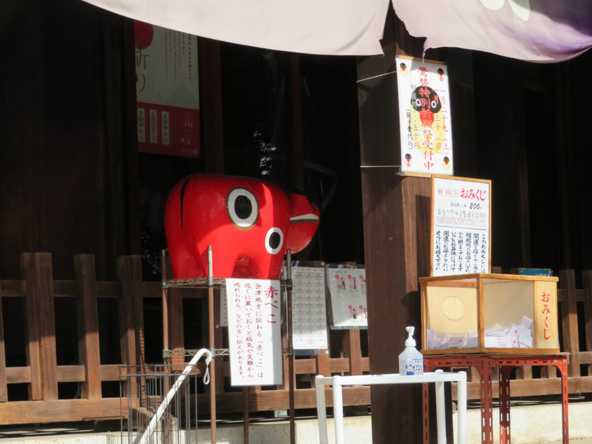 特別祈願は拝殿の中で斎行されますが、参拝所の前には鷽鳥の描かれたフォトパネルも設置されており、自らの祈りで前年の凶事や不運を、嘘と幸運に替えることができることでしょう。拝殿の中央には会津地方に伝わる赤べこも姿を現し、疫病厄除けのご利益が期待できそうです。