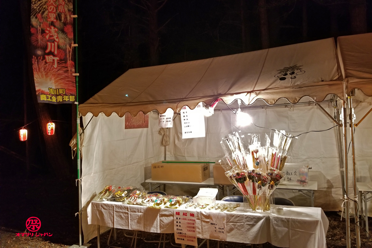 また縁起物の破魔矢などの正月飾り、そして浅川町ならではの魔除花火も販売されていました。この魔除花火はこれまでに色々な大きさが作られている様で、今回は新製品の1寸玉(直径約3cm)が並べてありました。