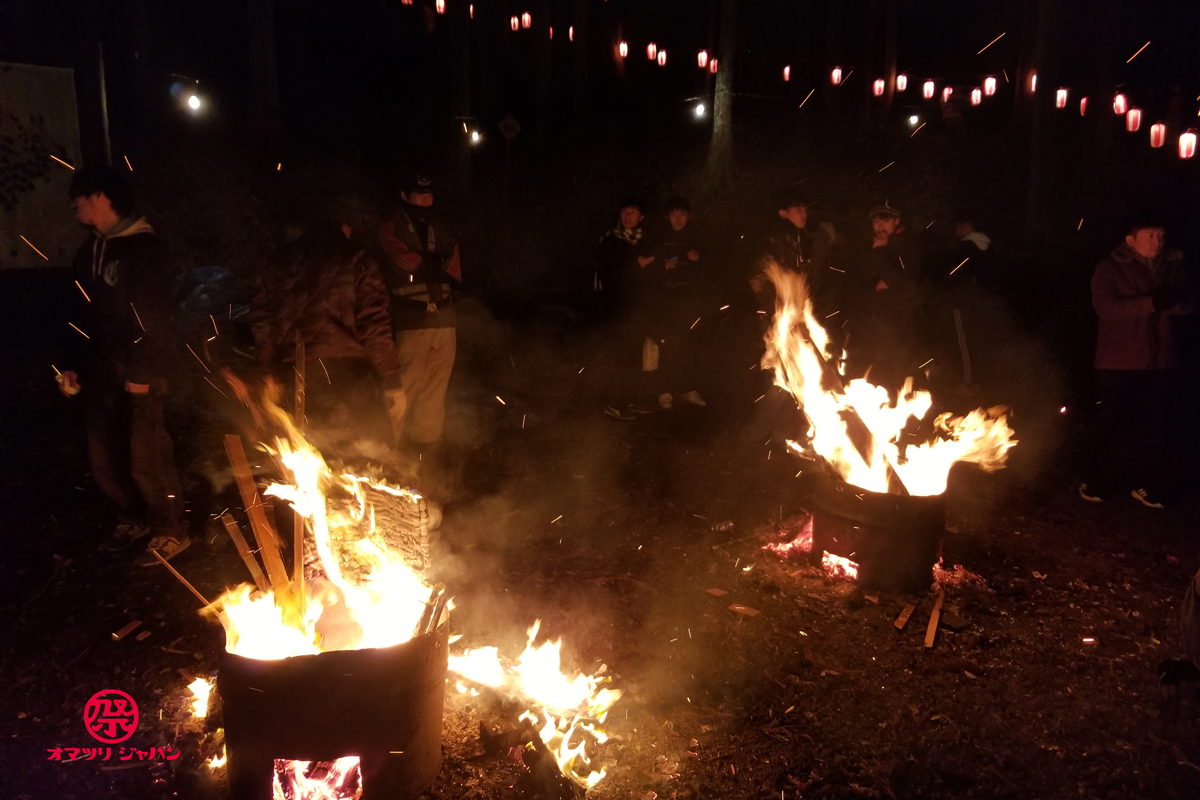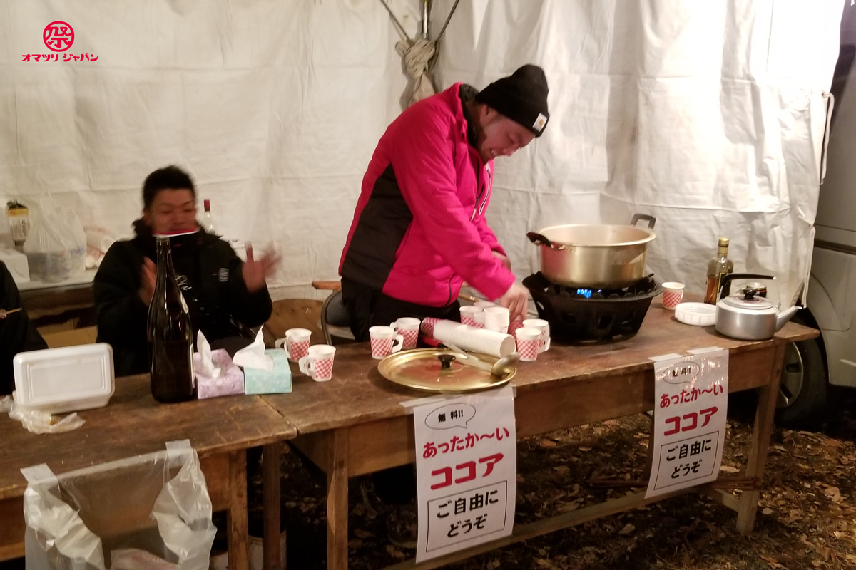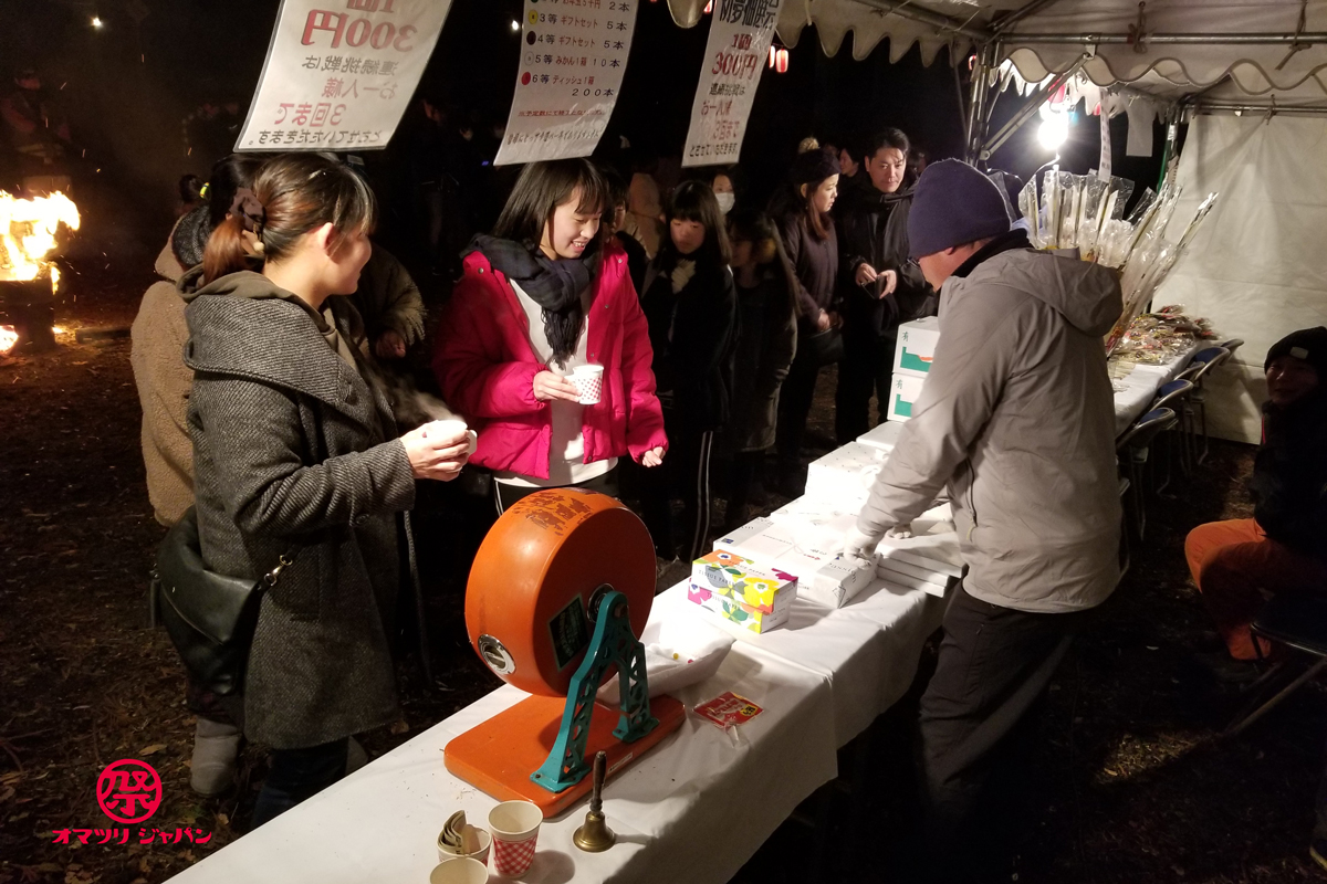 年が明ける1時間前の11時からは、白山比咩神社(しらやまひめじんじゃ)のふもとの広場に浅川商工会によるテントが並びます。来場者が寒くない様にと焚火が用意され、温かいココアの無料配布(作る人が違うので年によって微妙に味が変わるとかw)が行われています。