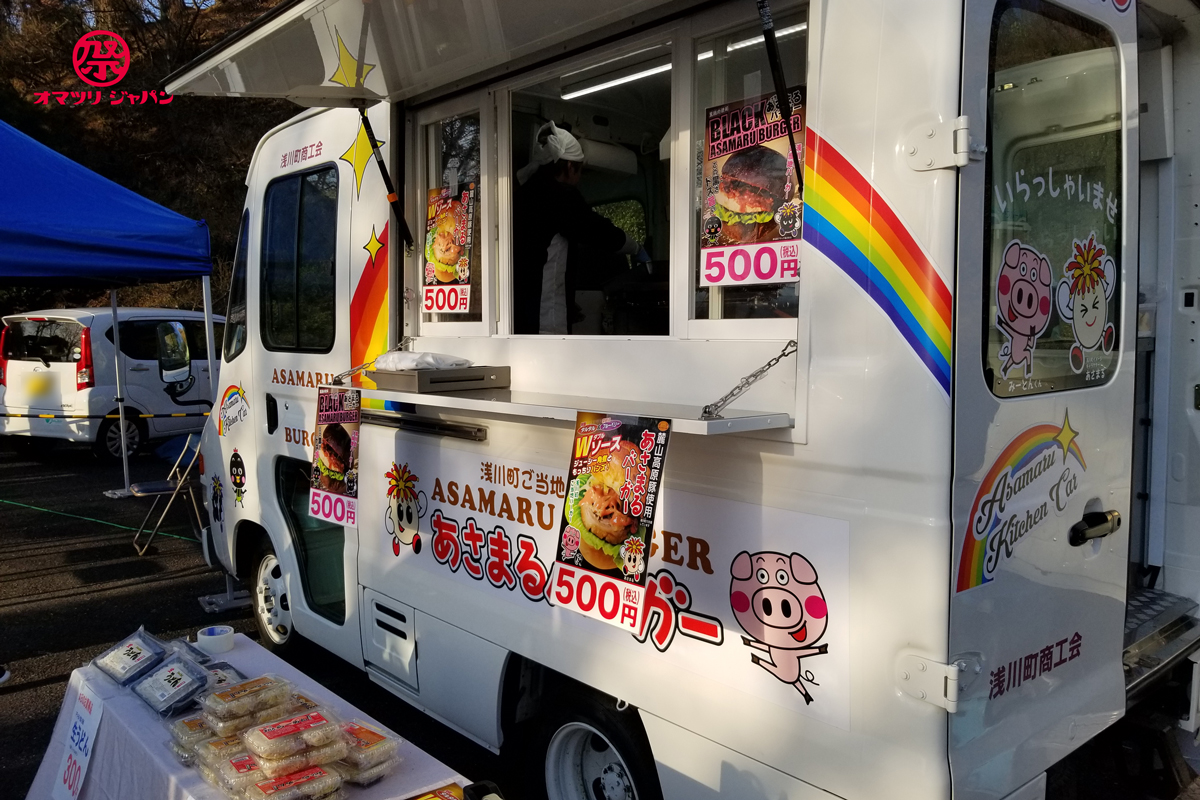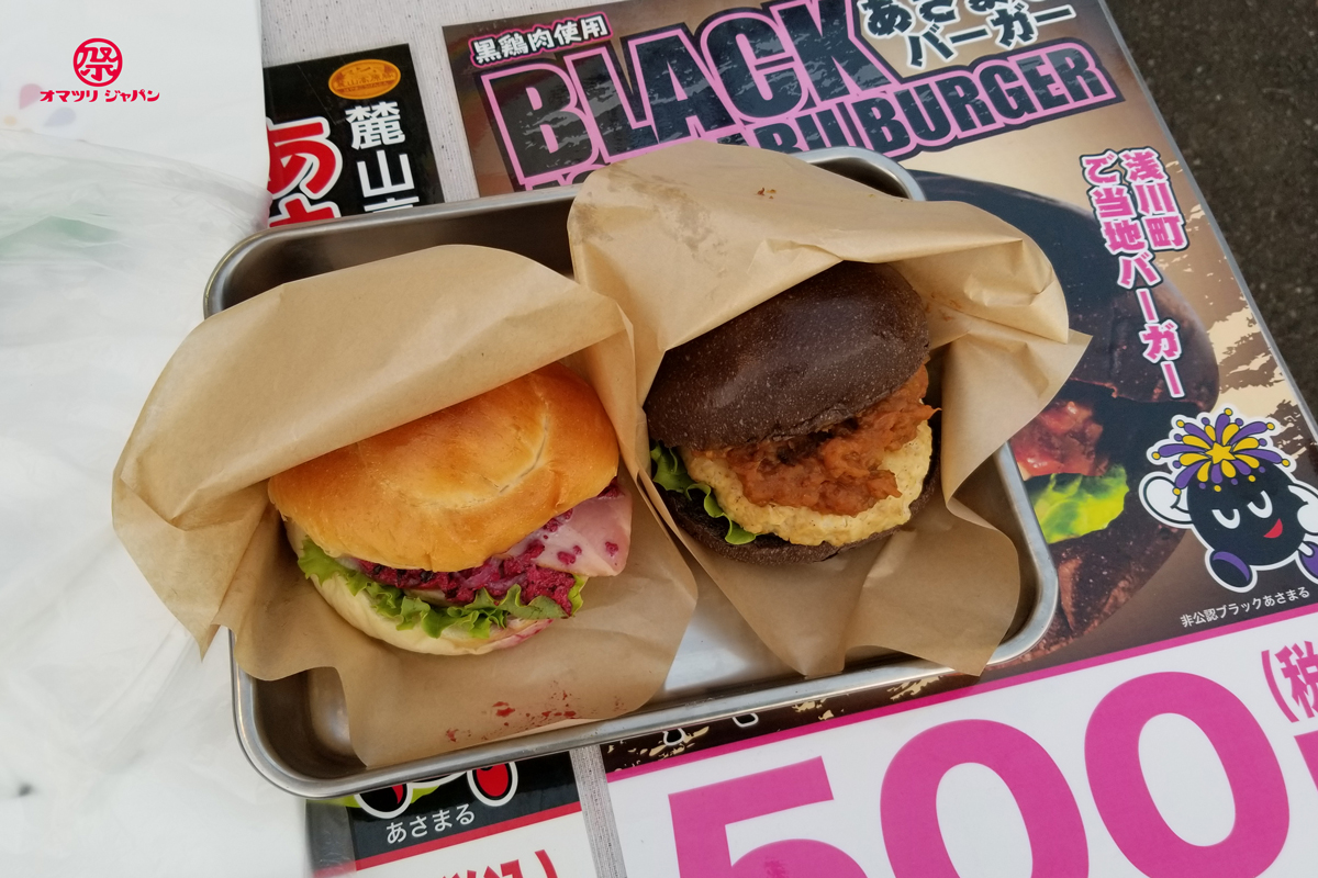屋台も少しは出ており、浅川町ご当地バーガーが販売されていました。地元で生産している麓山高原豚の角煮を使ったタルタルソースとブルーベリーソースを組み合わせたあさまるバーガー、黒鶏肉を使ったカレーソースのブラックあさまるバーガーの2種類。結構な大きさなので、1個でかなりお腹いっぱいになります。