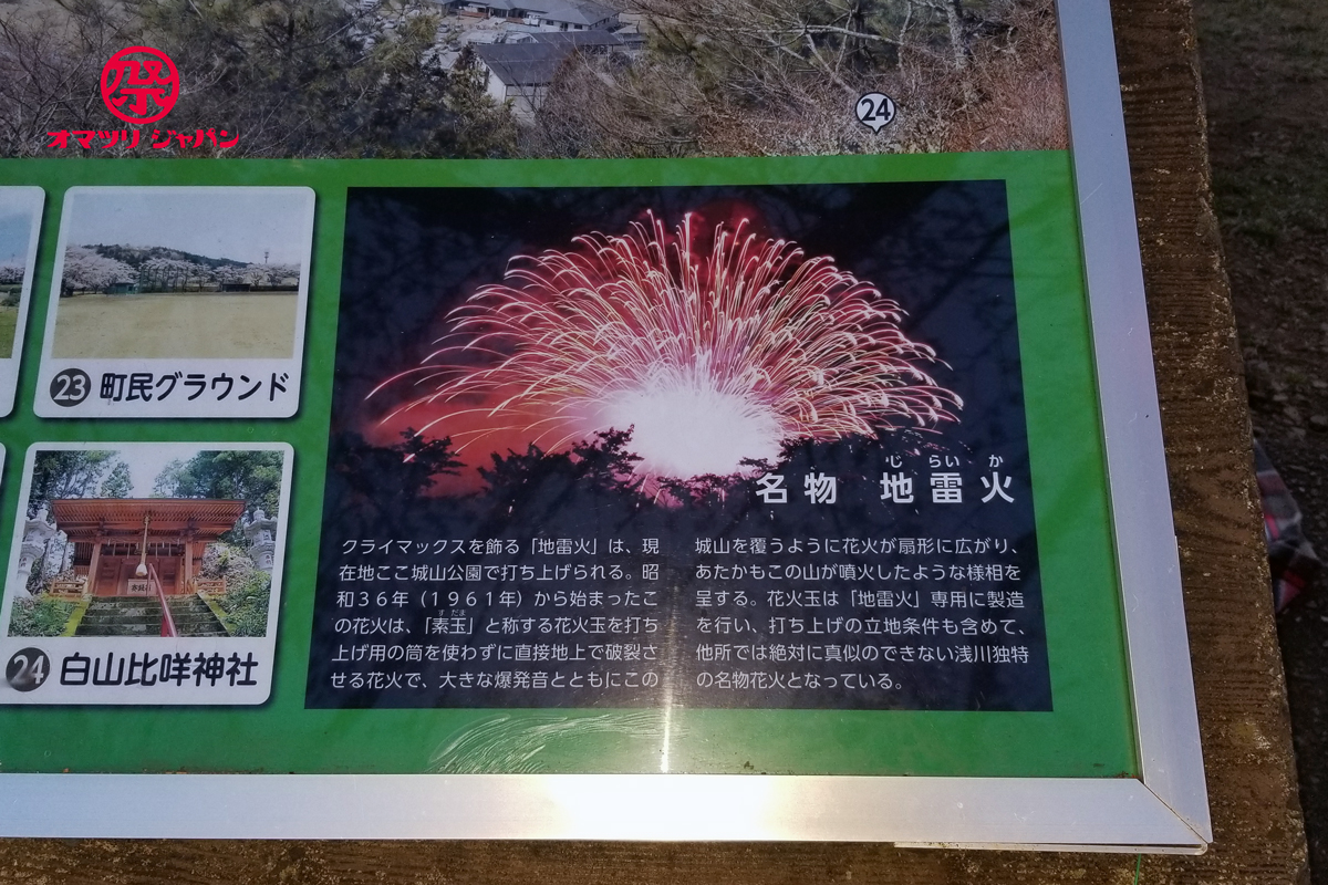 それから200年経った現在でも慰霊の花火は続いており、8月16日には打ち上がる大玉の数々、「大からくり」「200mにも及ぶ浅川の滝」、そして今回の観覧場所である城山公園の山肌を使った「地雷火」と花火の里ならではの貴重な花火が見られるそうです。