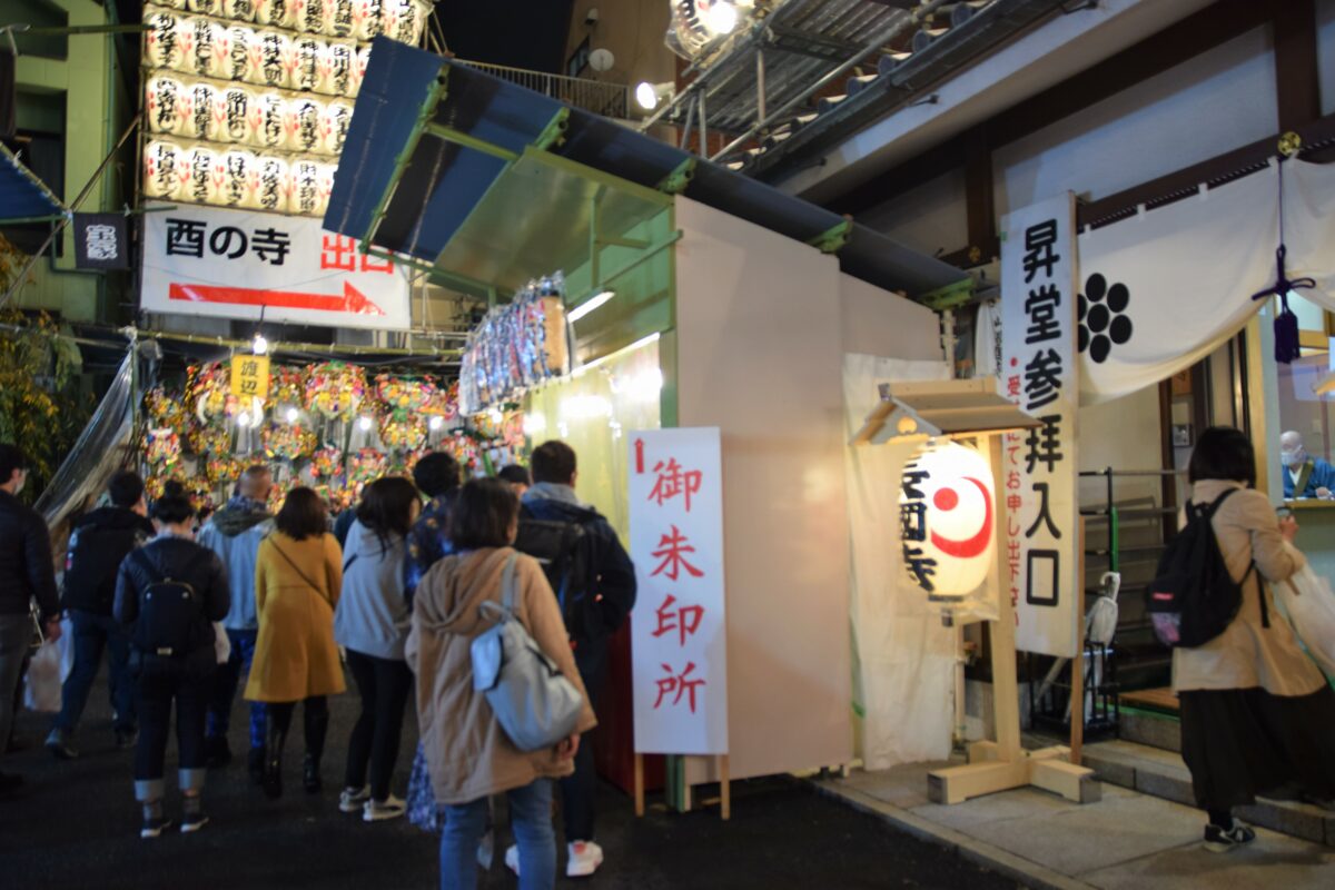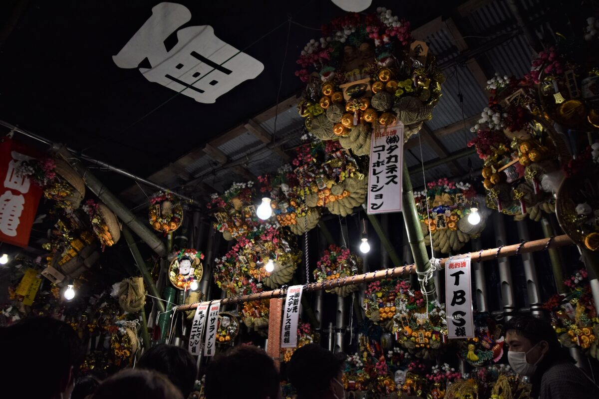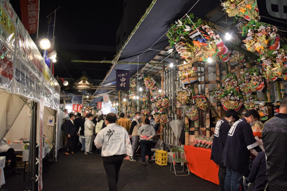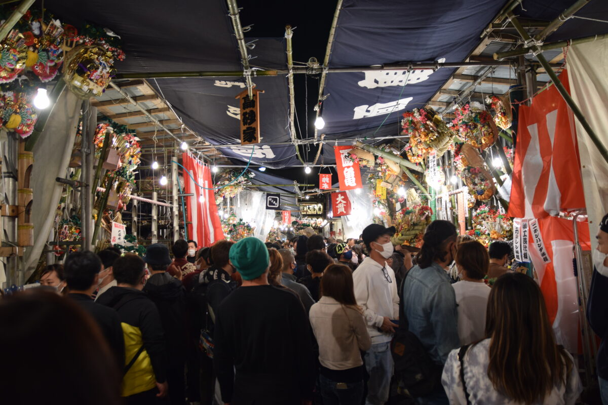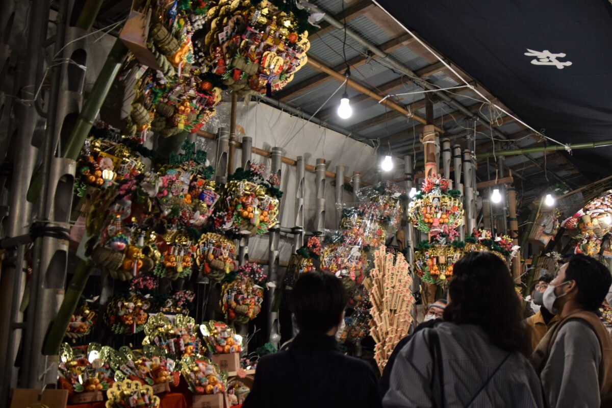 中に入ると、さっそく熊手の露店が奥までぎっしりと立ち並んでいます。到着したのが21:00過ぎと遅かったためか、混雑はそれほどでもありません。