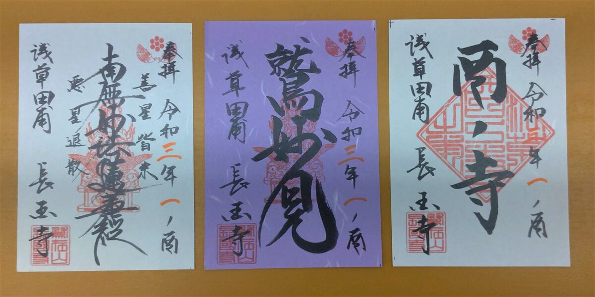 中央の薄紫色の和紙にご本尊の「鷲妙見」と揮毫されたものが、酉の市の時だけ頒布される限定御朱印になります(納経料は500円)。背景には鷲妙見大菩薩の姿の判が押され、右下に「一の酉」と書き入れてくださいます。二の酉に行ったときは「二の酉」と入れてくださるそうです。