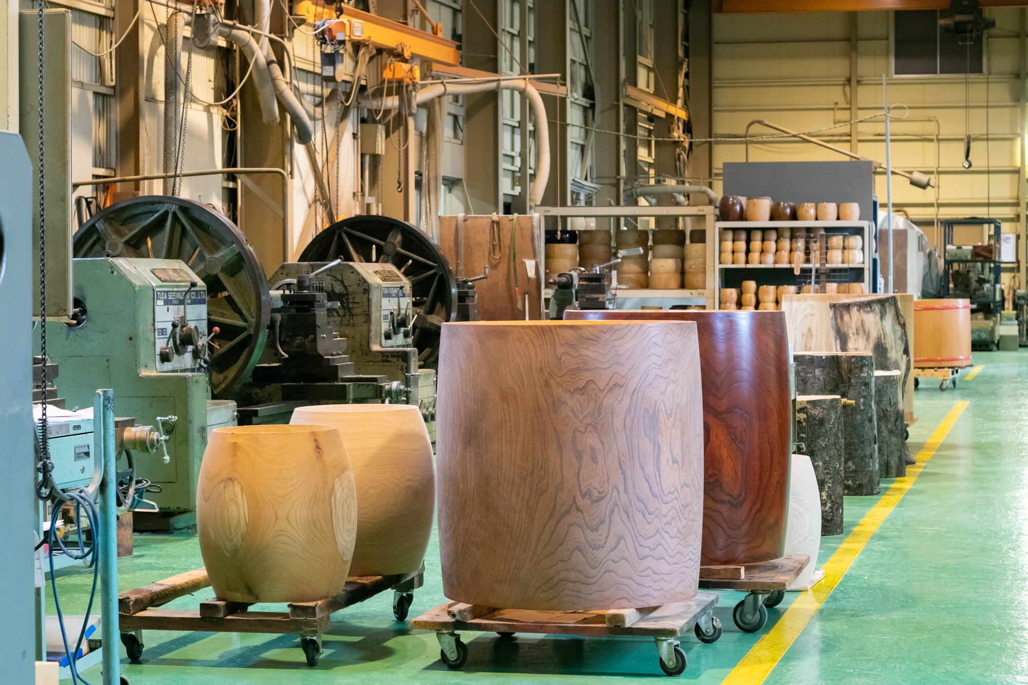 太鼓を作る工程の大まかな流れとしては、原木の伐り出しに始まり木材の内部を伐り出し、乾燥させ、塗装し、皮を張り、鋲(びょう)を留めて完成だ。今回は、切り出した木が運ばれてきて太鼓が作られていく過程を、浅野太鼓のショールームの隣にある工場にて見学させていただいた。