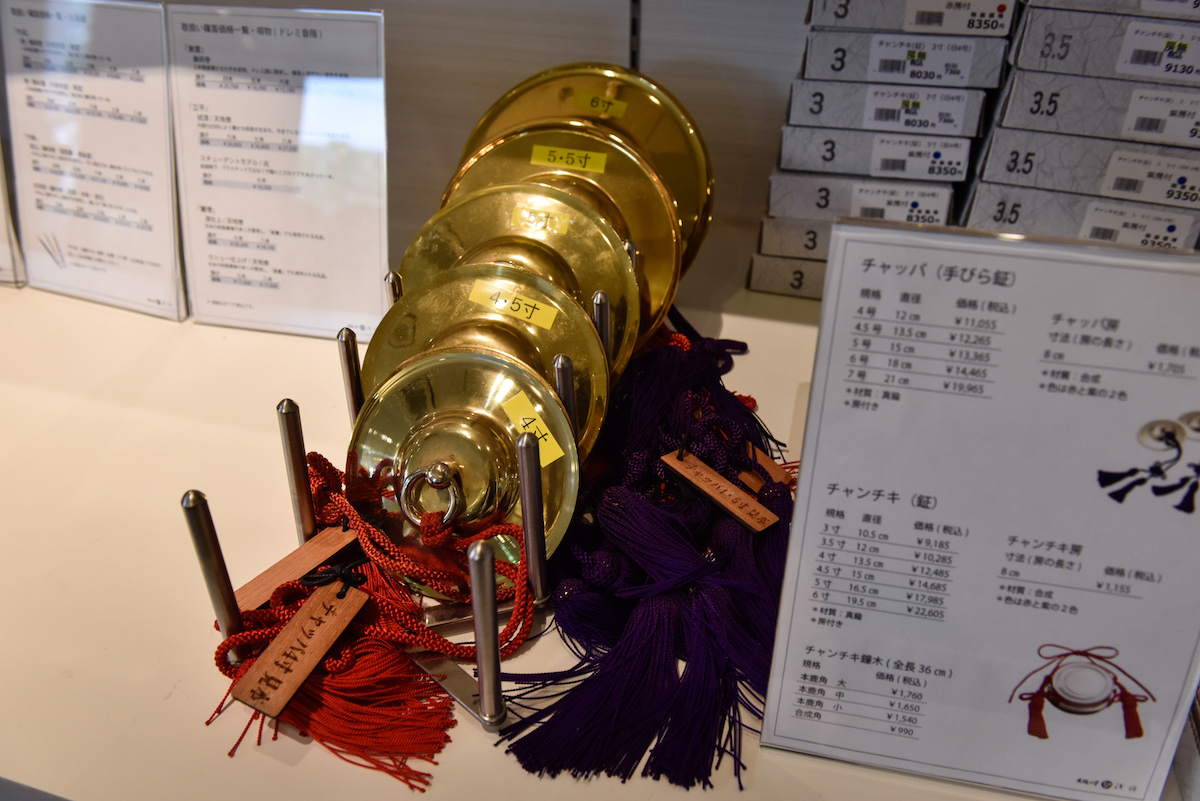 中には普段あまり見る機会が少ない「チャッパ」という鉦もあった。太鼓演奏にアクセントを添える「鳴り物」として使われるようだ。このタイプのものは、身軽に動きながら演奏でき、高音で軽快感を演出することができる。