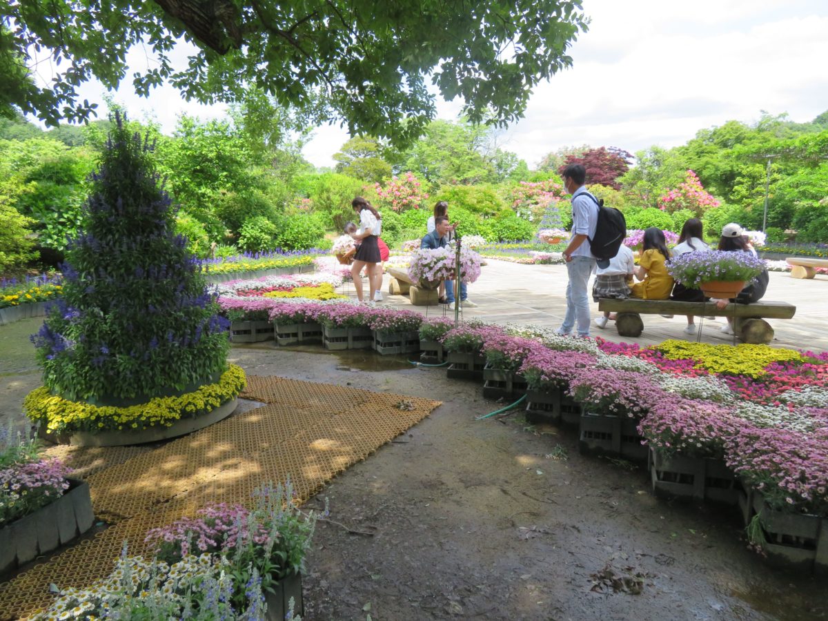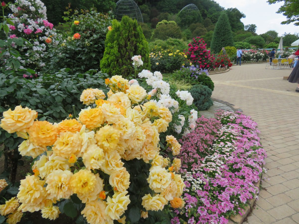 フラワーステージでは、色も形も異なる数多くのバラが、季節の花々に包まれています。