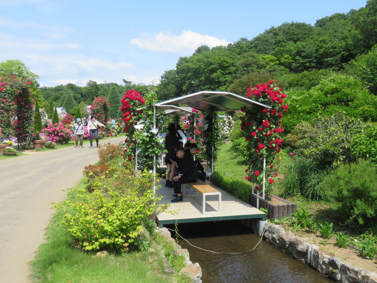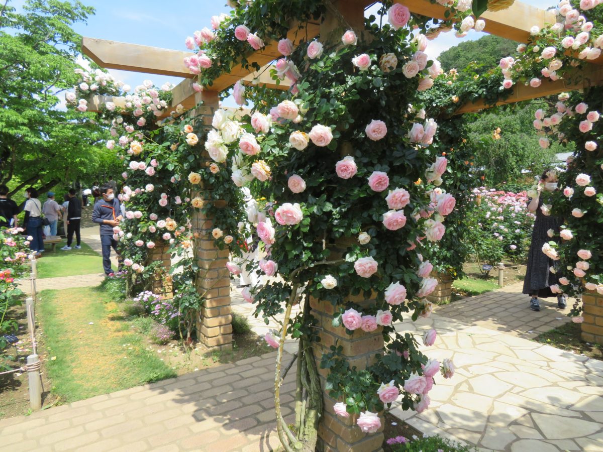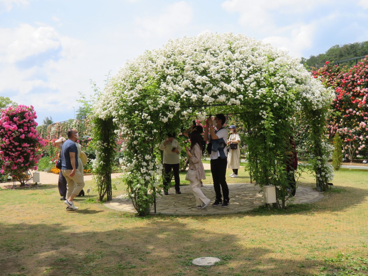 園内の各所には、パーゴラ、トンネル、ゲートが設けられ、バラが立体的な装飾を施します。周囲には日除けつきのベンチが設置されているので、休憩を入れながらバラの園を散策することができます。