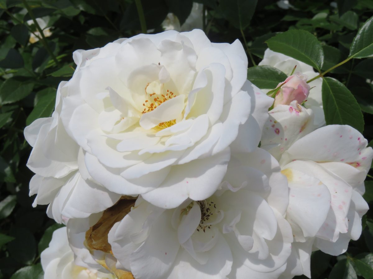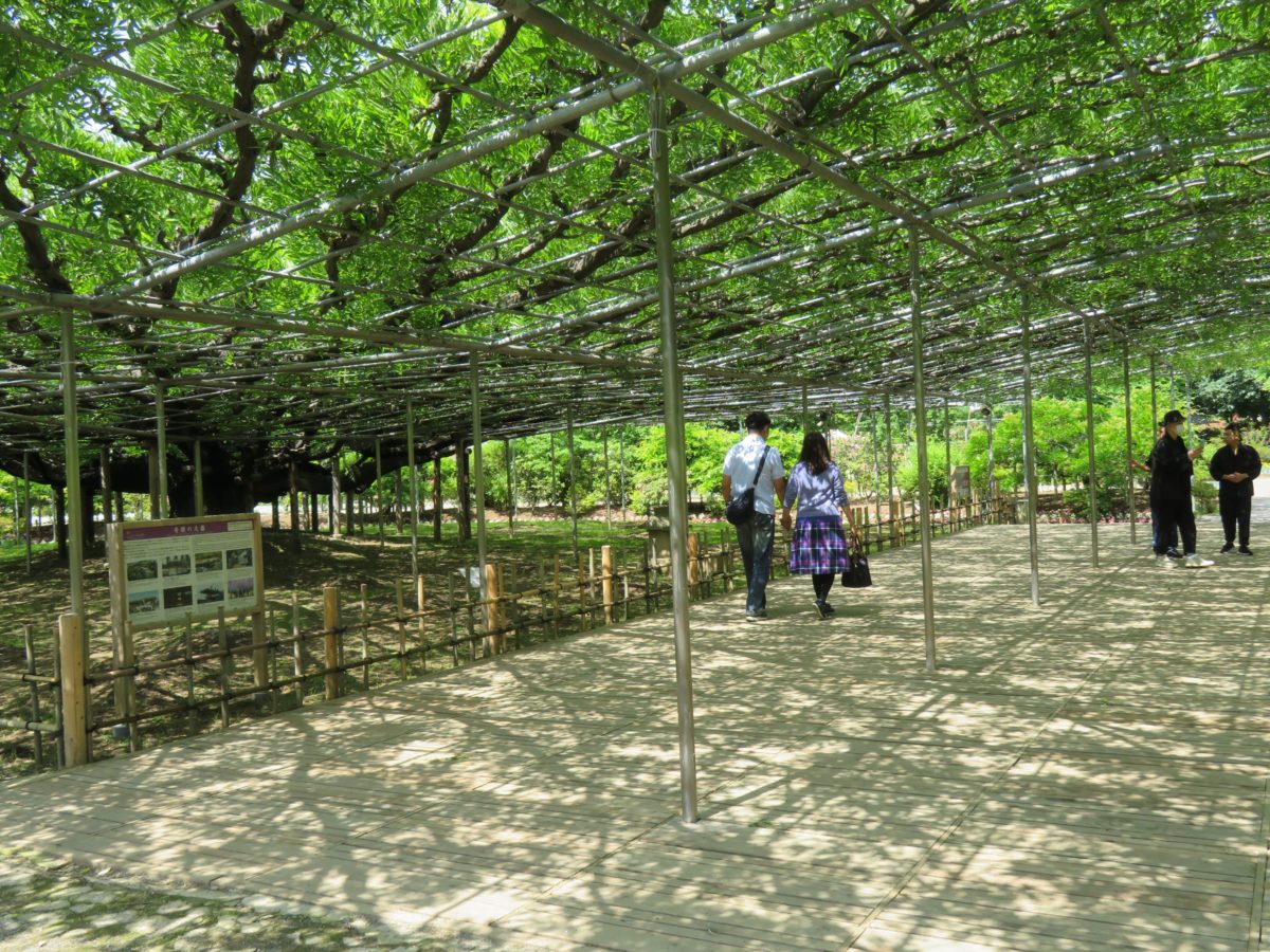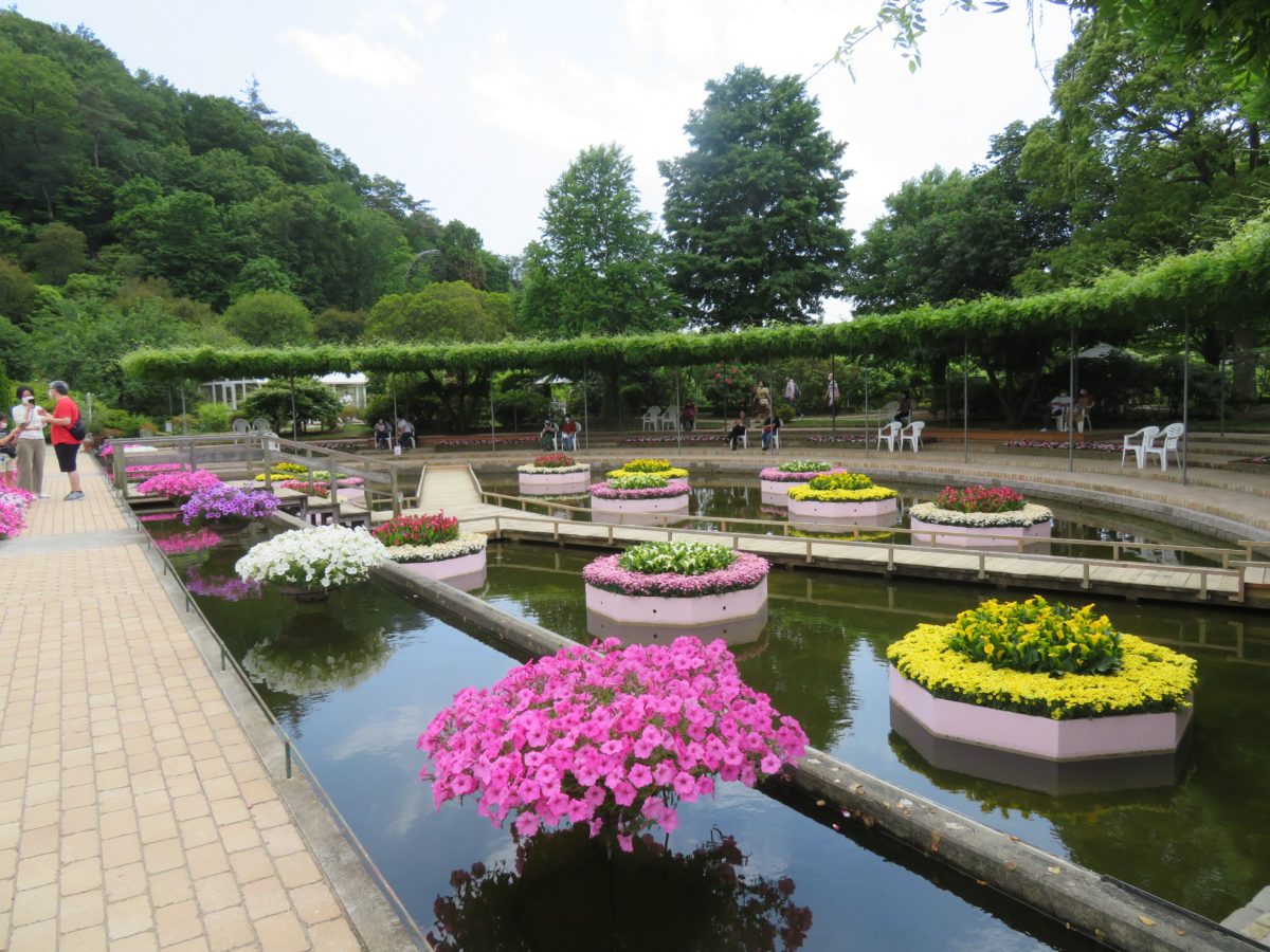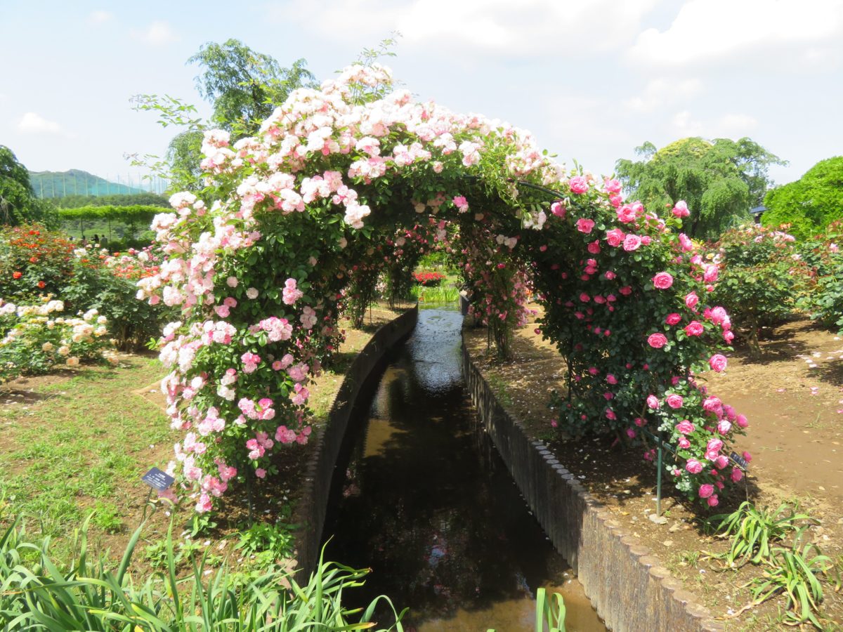 園内の各所には、パーゴラ、トンネル、ゲートが設けられ、バラが立体的な装飾を施します。周囲には日除けつきのベンチが設置されているので、休憩を入れながらバラの園を散策することができます。