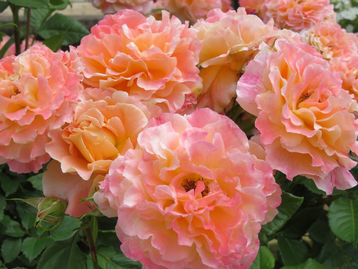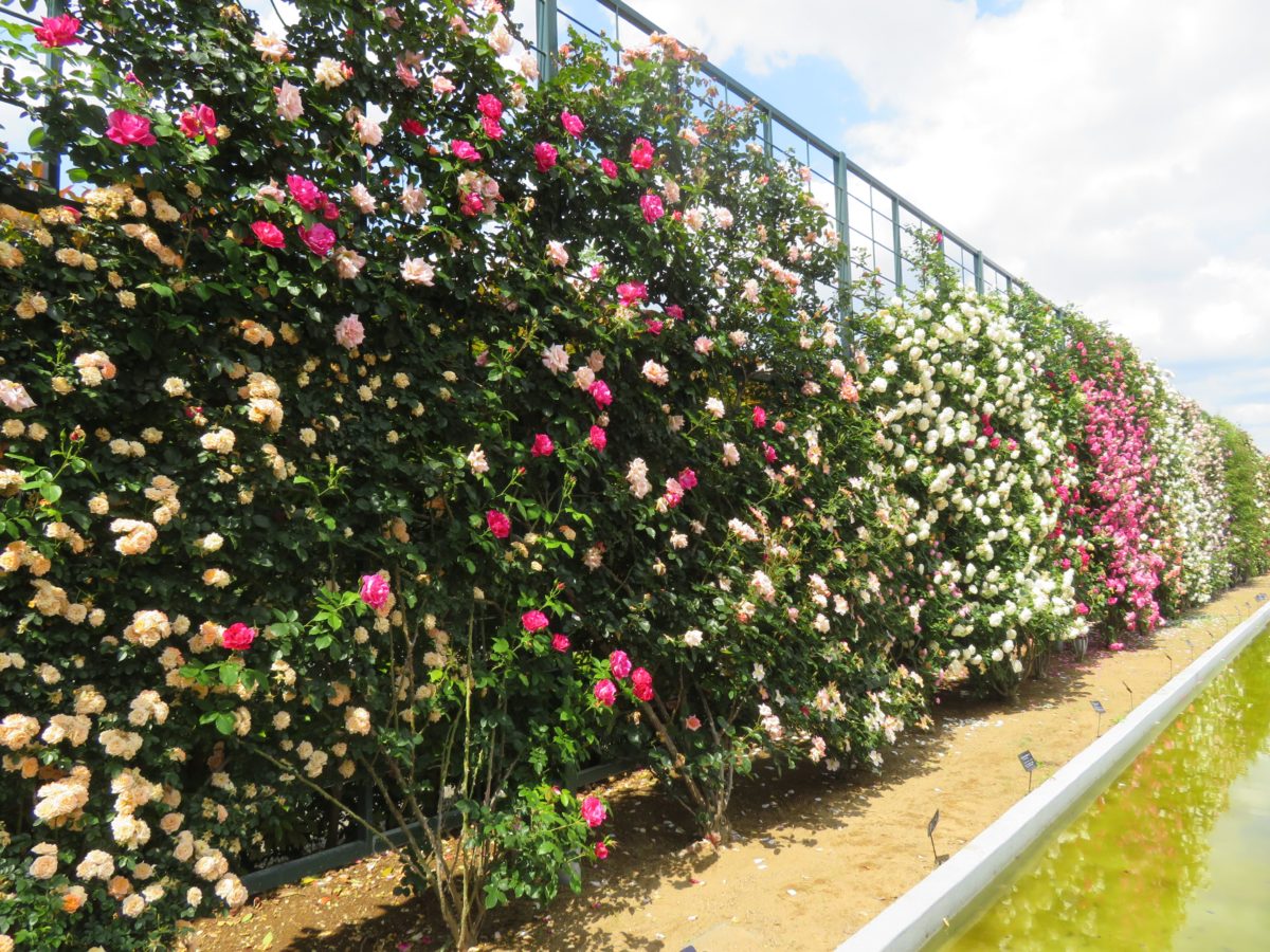 ローズガーデンの北面には色とりどりのバラの花が、高さ約4メートル、幅約120メートルの壁画を描いているかのようです。