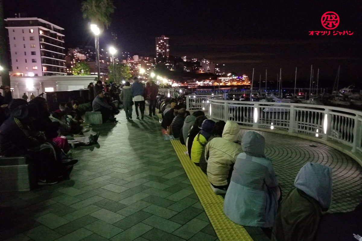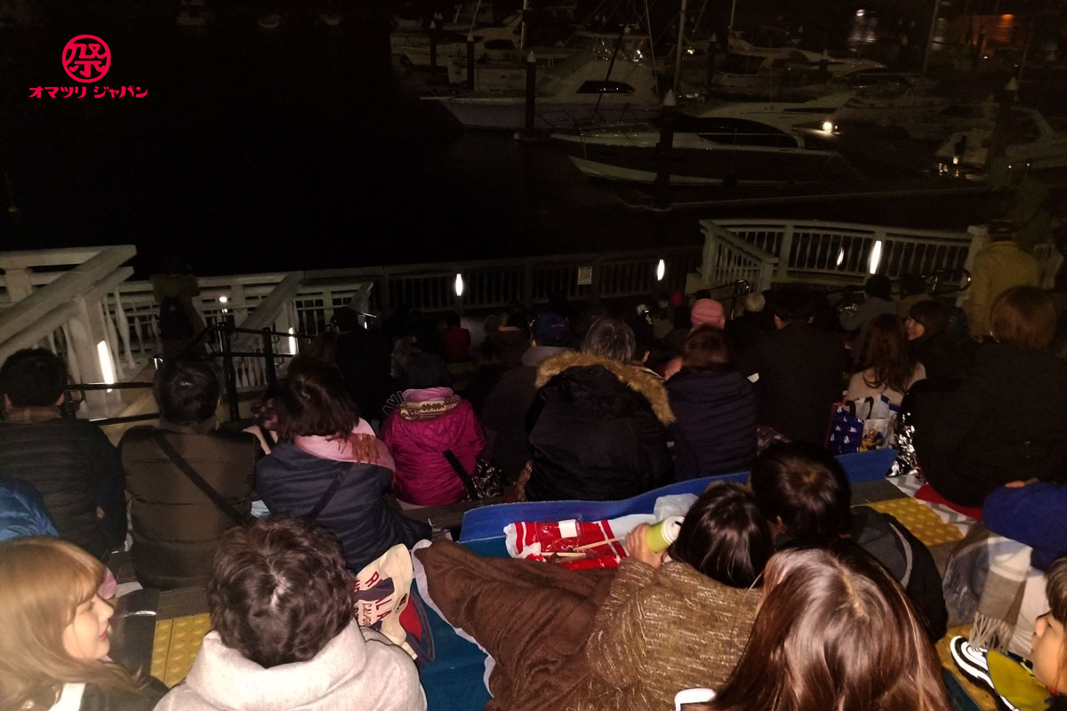 観覧場所ではこの寒空の中にも関わらず、打ち上げ開始を今か今かと多くの人達が集まっていました。夏の開催期には有料席になる場所も冬の時期には無料になります。