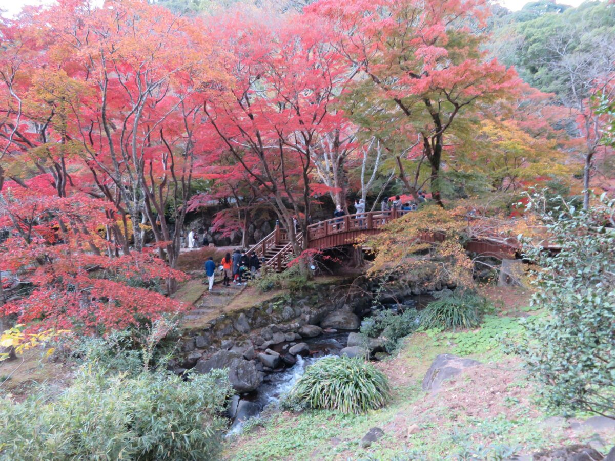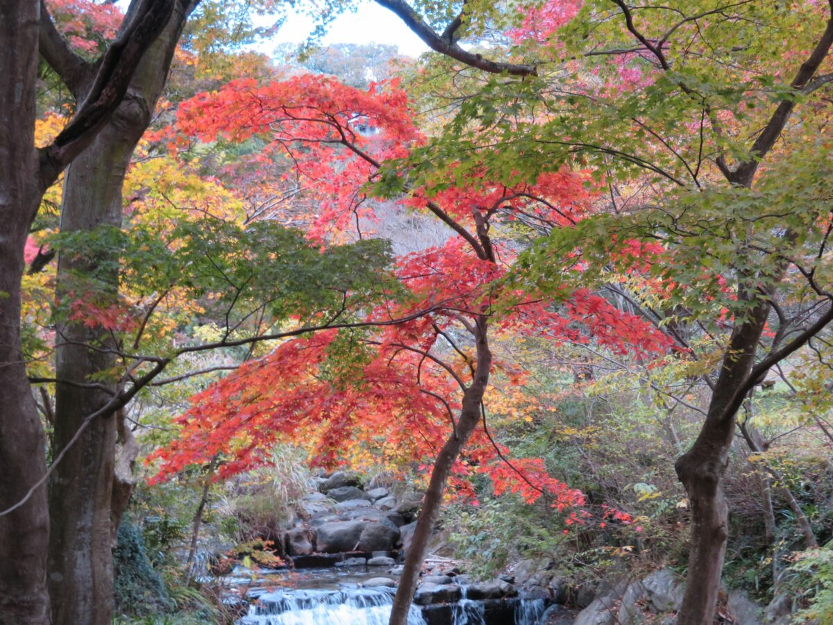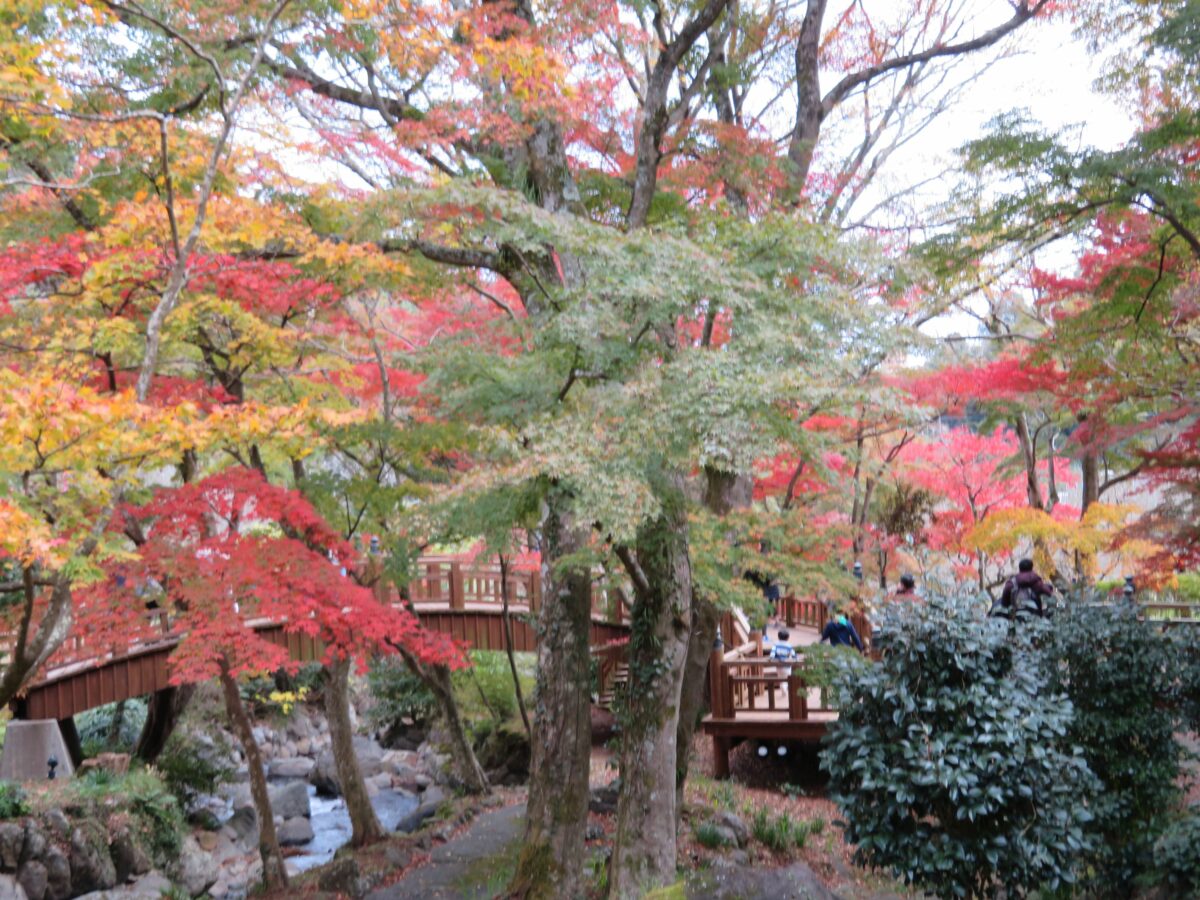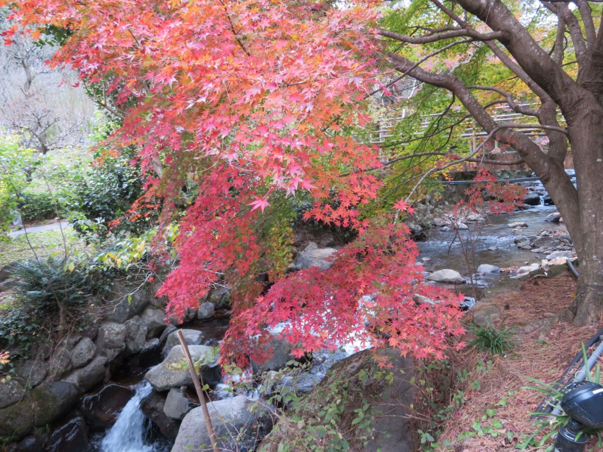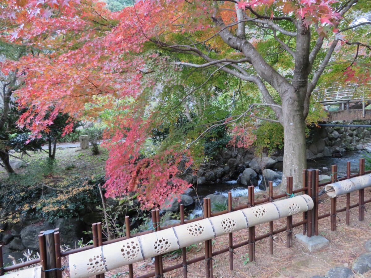 梅が主役の熱海梅園ですが、イロハモミジをはじめ、ムサシノ、イチジョウなどのカエデ類が梅の樹の間隙を埋め、春とは異なる彩りで染め上がります。園内を南北に流れる初川が秋色の化粧を纏うのです。