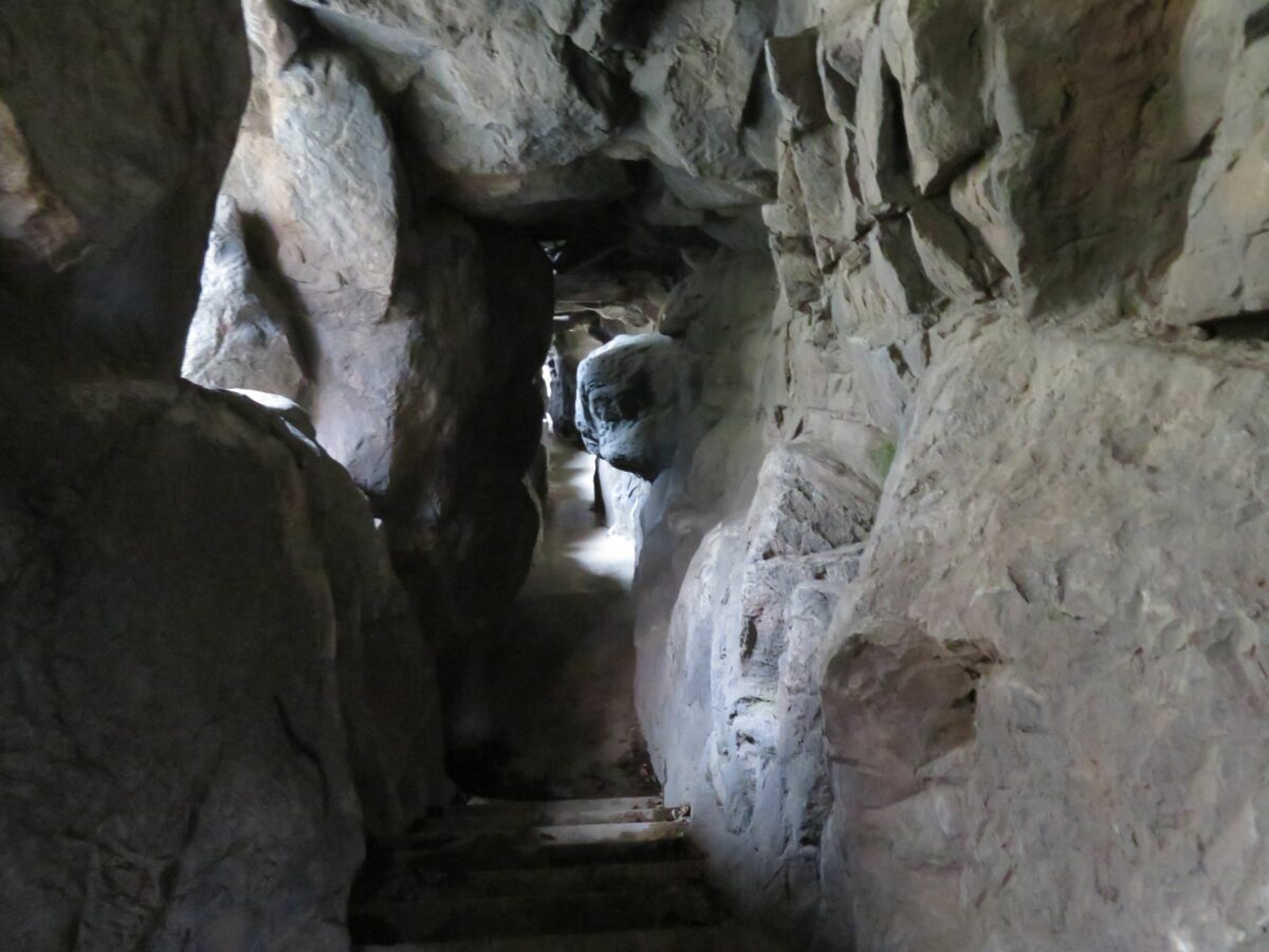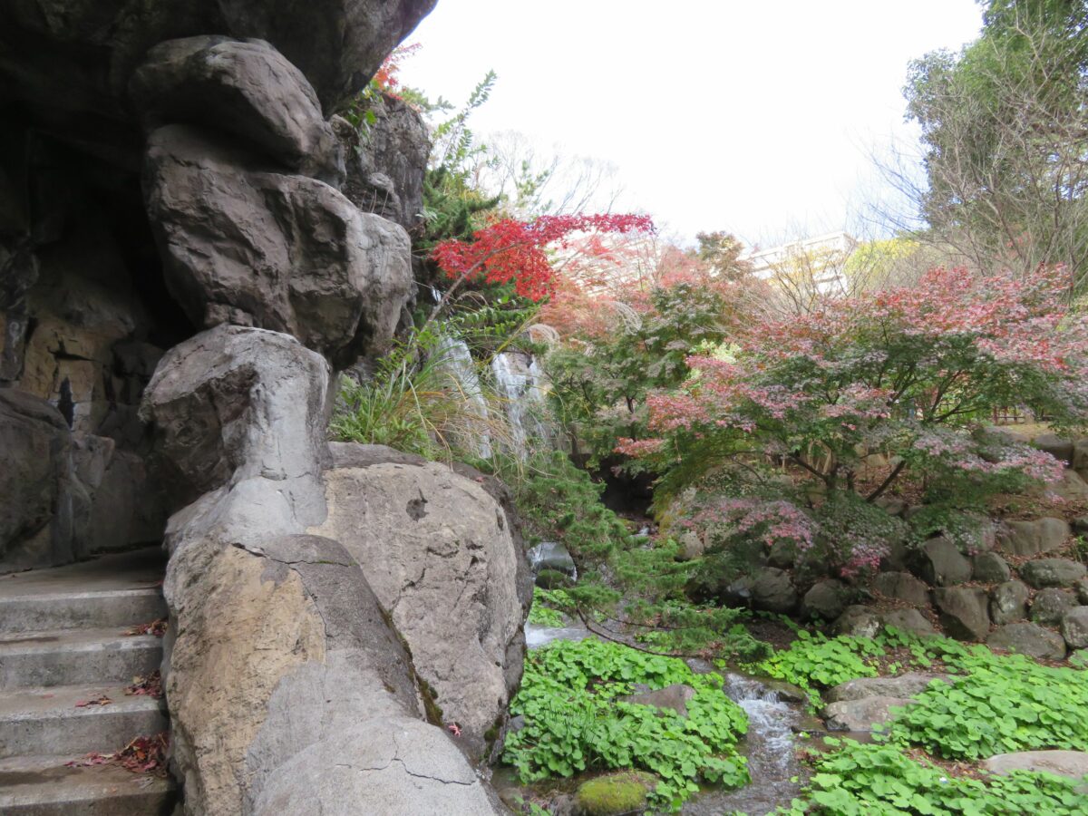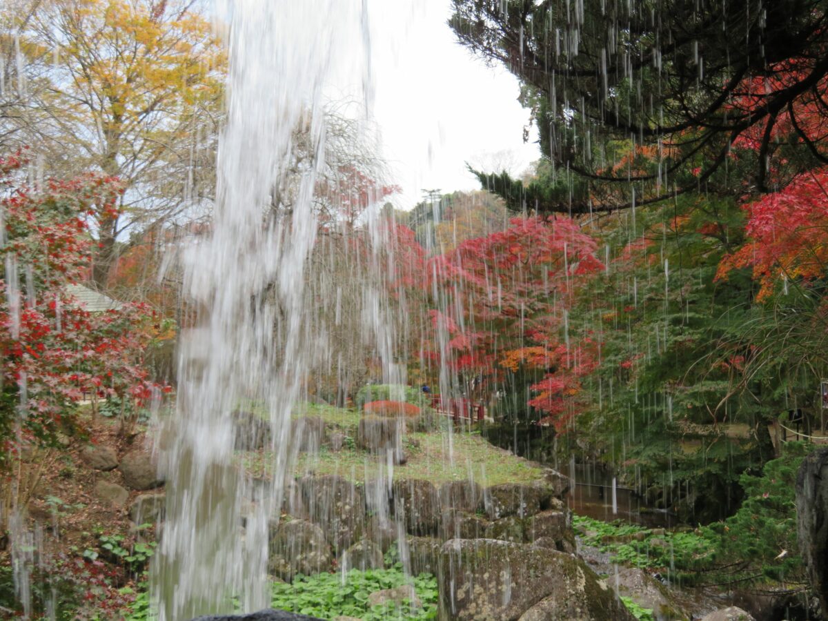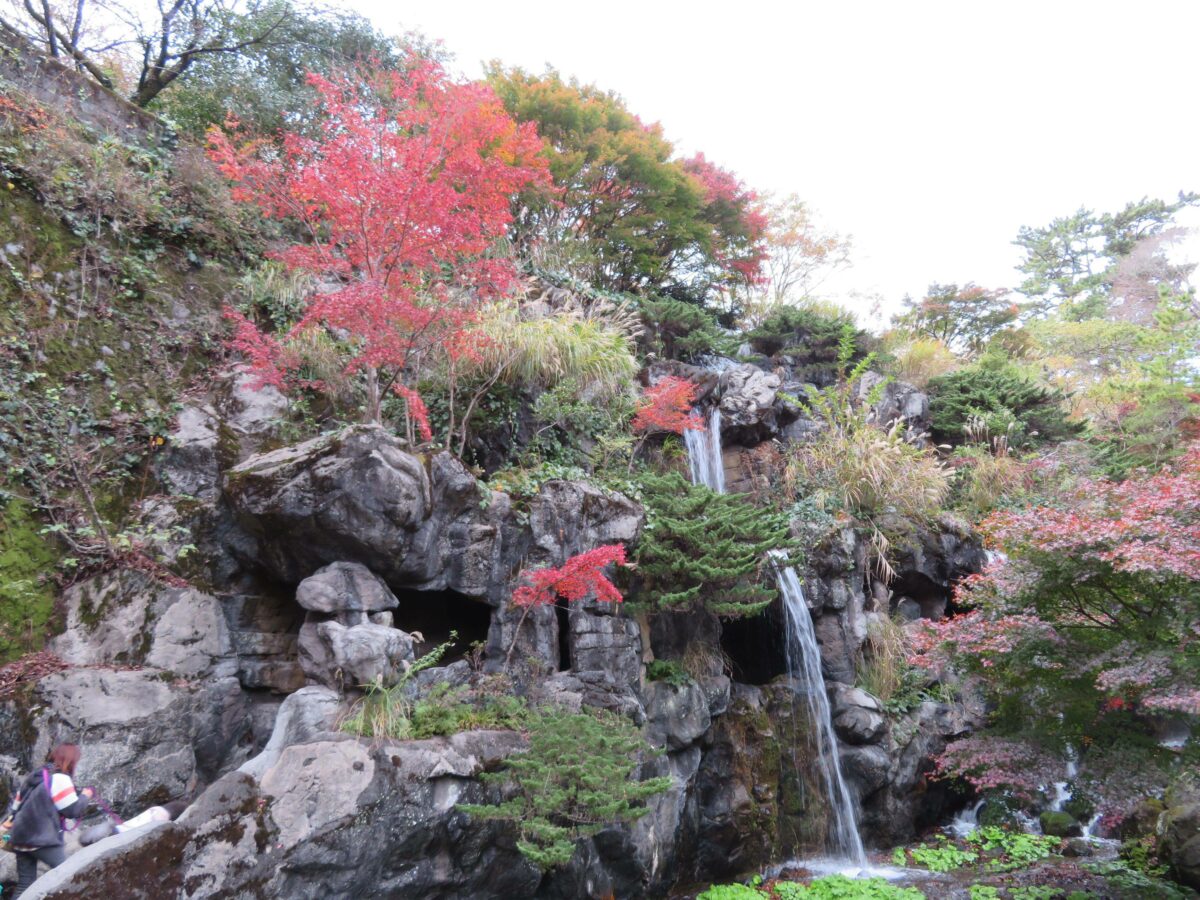 駐杖橋の北では、梅見の滝が水しぶきを上げています。春には文字通り観梅のスポットとなりますが、秋の景観も引けをとることはありません。岩肌を紅葉が彩るばかりではなく、滝を作る洞窟のような岩壁の中に入ることができ、滝の裏側から流れ落ちる水を見られる“裏見の滝”になっています。滝の水しぶき越しに紅葉狩りができるのです。