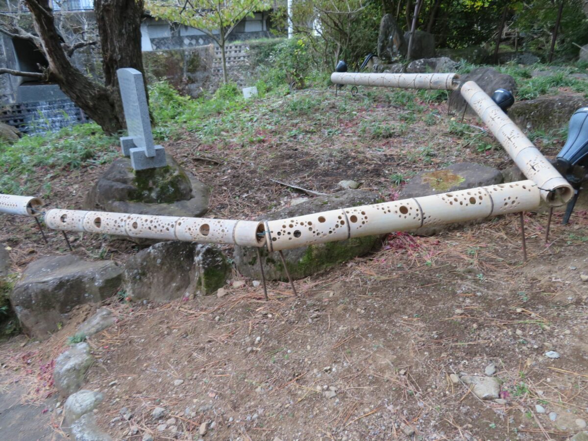 足湯は日中で閉じられますが、夜間になるとライトアップが行われます。カエデ類の樹を囲むようにライトアップに利用する竹の管が準備されています。竹には模様を描くように穴があけられ、この穴を通してこぼれる光が紅葉を照らし出すようです。石湯や夜間ライトアップの他にも、「熱海梅園もみじまつり」の期間中の日曜日にはジャズのステージ・ライブも企画されています。