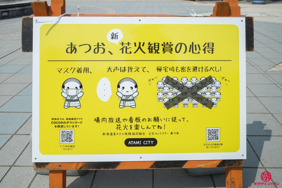 メイン会場となる熱海親水公園には「あつお、新花火観賞の心得」と題した花火大会を鑑賞する際の注意点を掲示し、観覧者に対して感染症対策への協力を呼びかけられています。