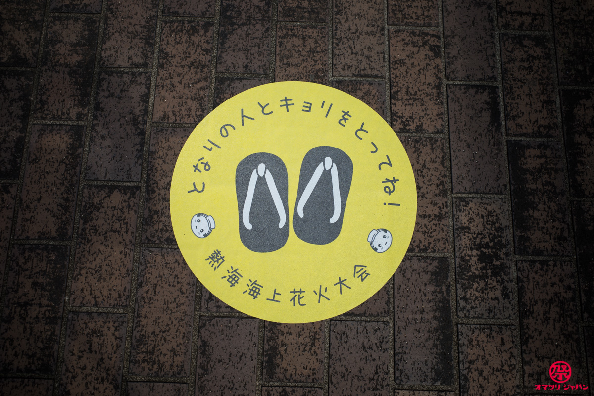会場内に貼付されたソーシャルディスタンスを促すステッカー