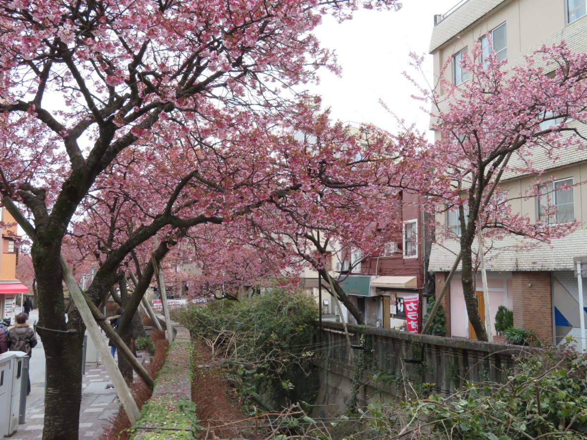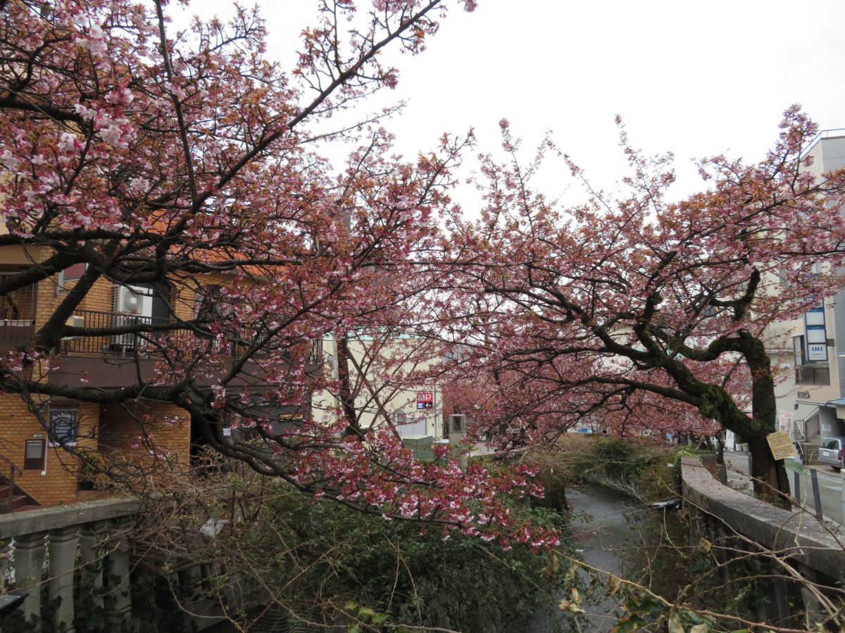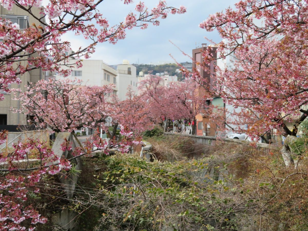 例年1月上旬から2月上旬にかけて、濃いピンク色の花をつける熱海糸川沿いのあたみ桜