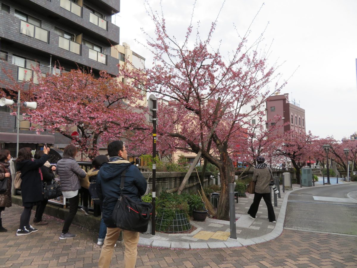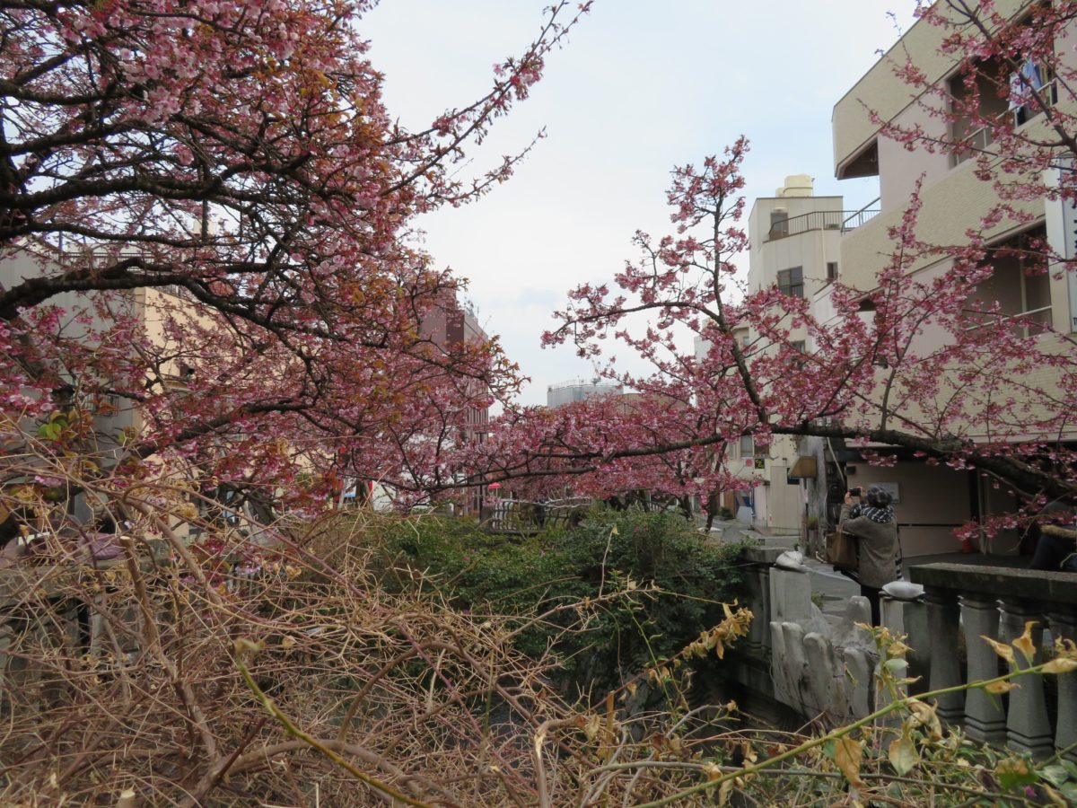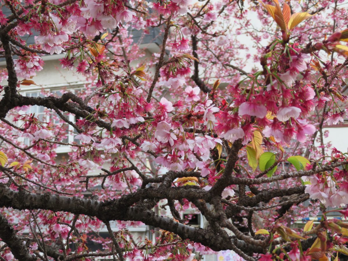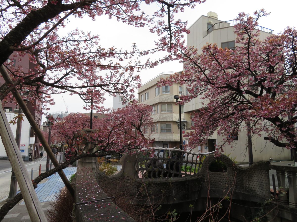 例年1月上旬から2月上旬にかけて、濃いピンク色の花をつける熱海糸川沿いのあたみ桜