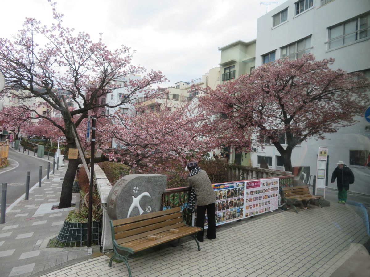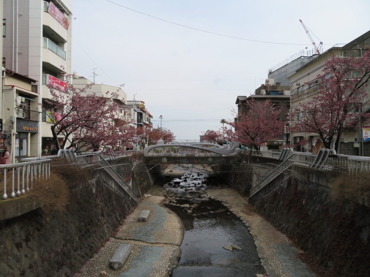 首都圏から気軽に行ける温泉リゾート地の熱海では、温泉街の中心を糸川が穏やかに流れています。川に沿って約300メートルの遊歩道が整備され、58本のあたみ桜が植樹されています。