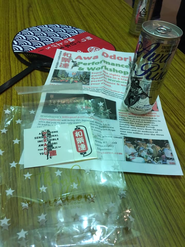 帰りのおみやげに、和楽連さんのオシャレなステッカーと阿波踊り専用エナジードリンクを頂きました。