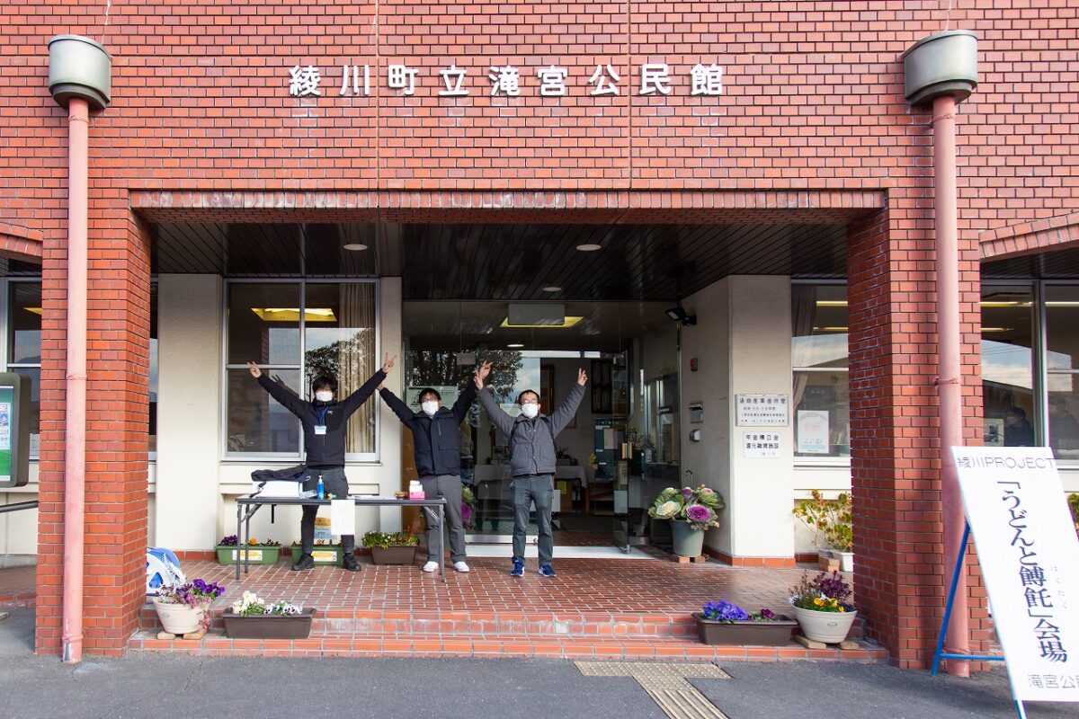 綾川PRPJECT「うどんと餺飥(はくたく)」の会場である綾川町立滝宮公民館に到着すると、すでにスタッフさんたちは準備万端整い、楽しそうにポーズにも応えてくれました。