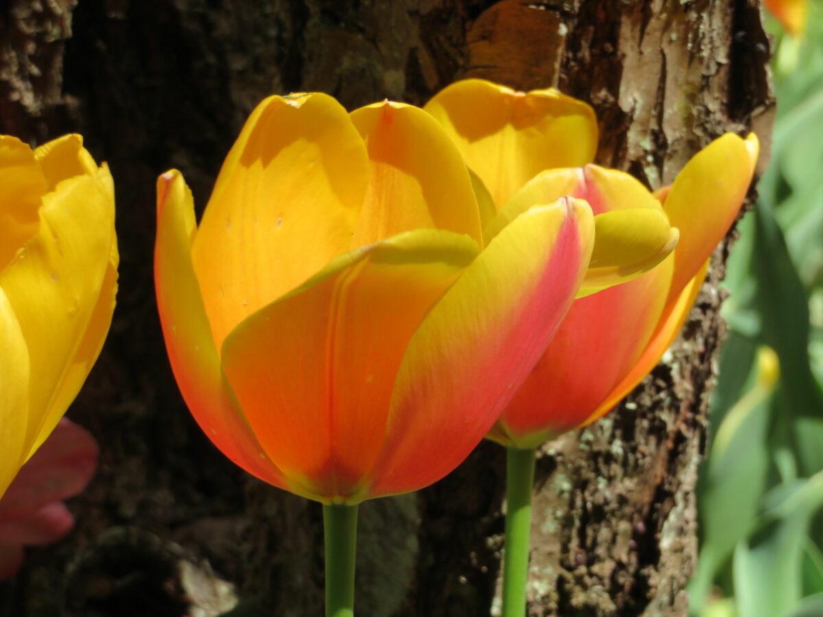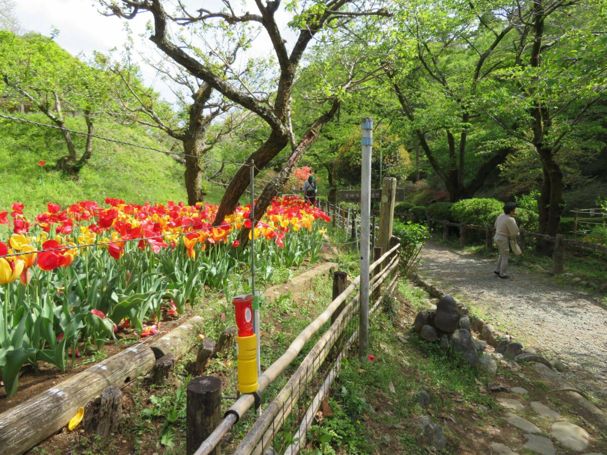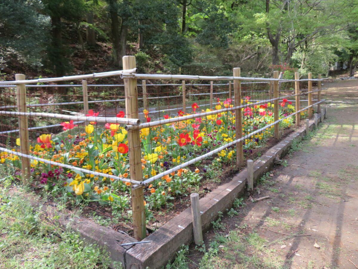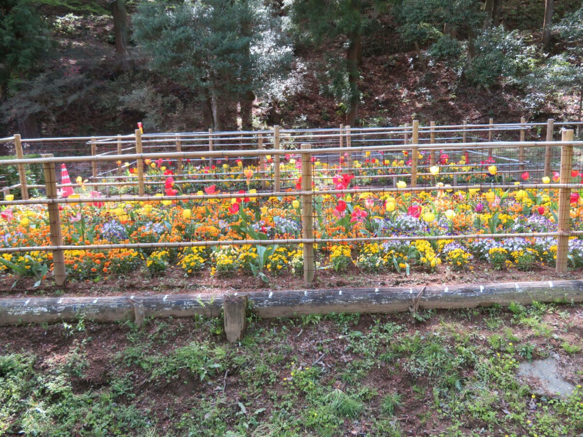 園路の西のエリアにもミックス花壇が設けられていますが、こちらはチューリップの品種ばかりでなく、パンジーなども仲良く寄り添い、彩りがより豊かになっています。