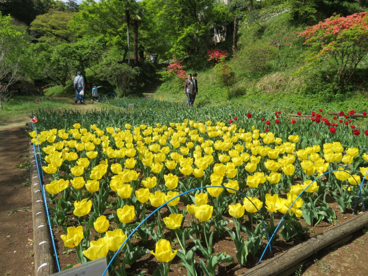 群馬県桐生市の吾妻山麓に広がる植物園の春の主役は、10,000本のチューリップ。園内15か所の花壇に、レッドインプレッション(赤)、白雲(白)、ギャラン(黄)ピンクインプレッション(桃)、マリット(赤/黄)など12種類のチューリップが花開きます。