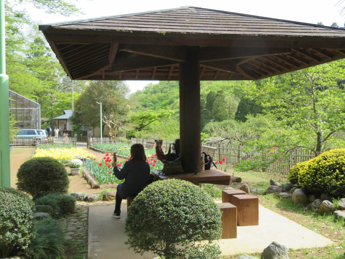吾妻公園では15の花壇で12種類のチューリップが栽培されています。園路の東部の小高いエリアの花壇では、品種ごとに分けて育てられており統一感が漲ります。花壇の北端には四阿が設けられているので、腰を据えて各々のチューリップの特徴を観察することができます。