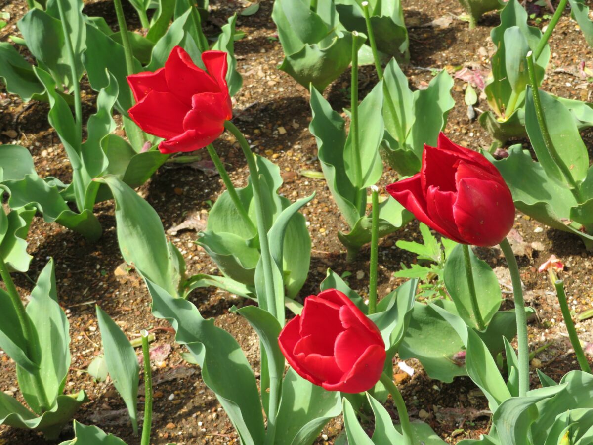 公園中央の園路沿いにはミックス花壇が設置されています。数種のチューリップが鮮やかな色彩の花を咲かせていますが、各々の色彩が競うあうことなくバランスよく溶け合っています。