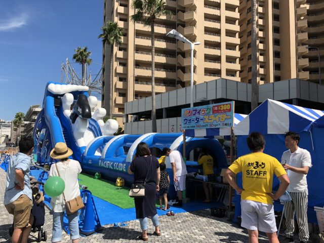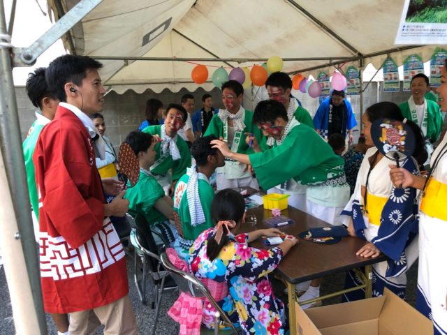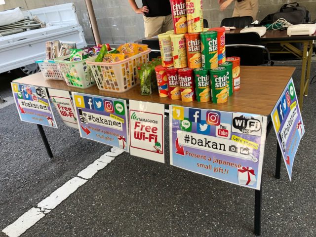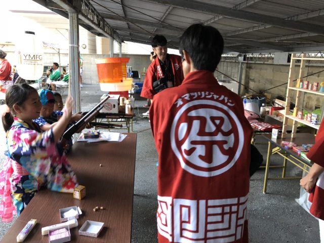 山口銀行の駐車場では同社の皆さんがジュース、ビール、かき氷、わたあめ、射的などの縁日をエンジョイ!特に人気だったのは射的。外国人の方やお子さんが夢中になり、一人で何回も並んでいる子も!笑