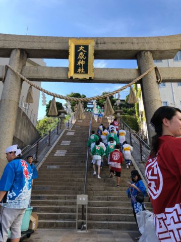 山口銀行の皆さんは踊りに参加する前に、会場近くの「大歳神社」へお参り。115段の階段を上った先に社殿にて宮司さんにお参りをしてもらい、準備万端!